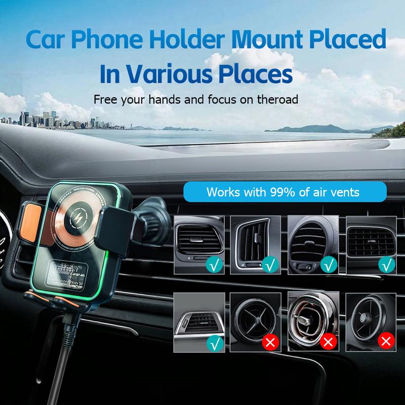 2-In-1 Design: Simplify your life with our versatile wireless charger and car cell phone holder. It ensures a secure hands-free experience, eliminating the hassle of tangled cords or cables. Our cell phone holder is compatible with car windshields, dashboards, and air vents, making GPS navigation and phone calls more convenient than eve