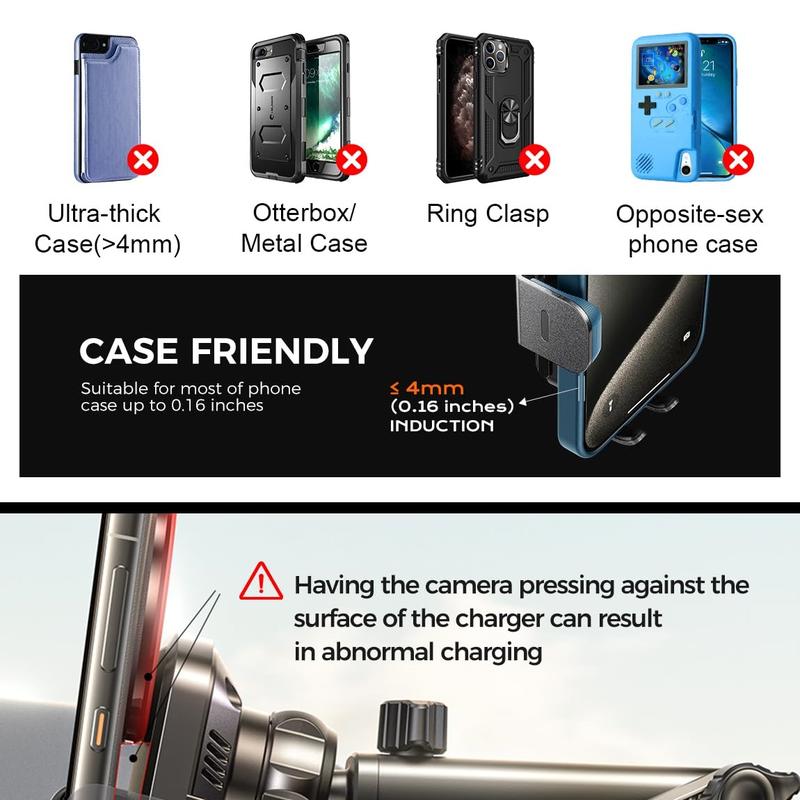 Charge through phone cases up to 4mm (0.16 inch) thick—no need to remove your case! But heads up, it’s not compatible with OtterBox cases (they’re too thick). Avoid using metal cases, magnets, credit cards, grips, or stands, as they can mess with the charging. Adjust the 360° rotating sphere, retractable bracket, and base for the best view while driving safely.