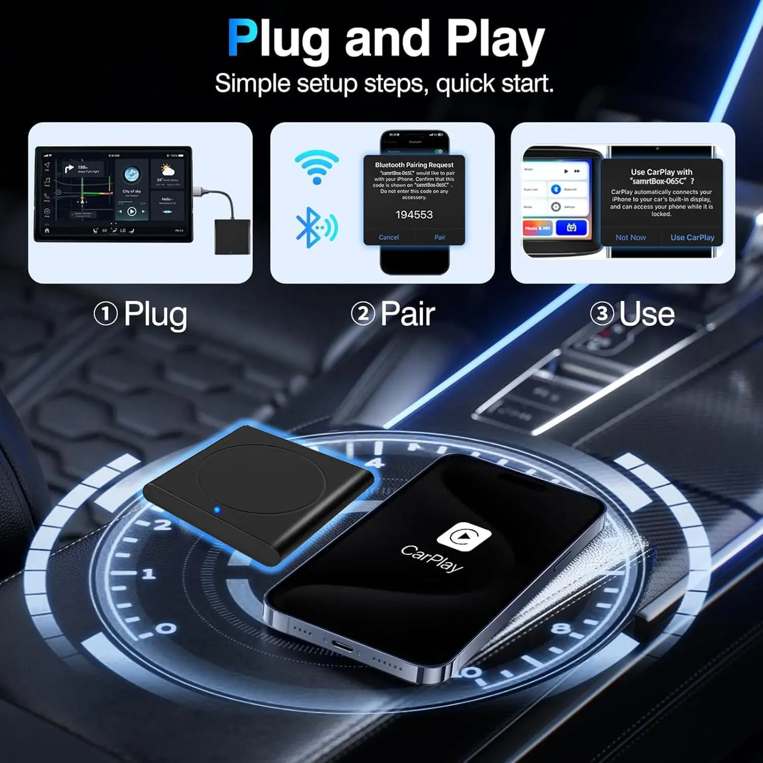 ·After the first installation of Wireless CarPlay, plug carplay adapter into car's USB port, it will automatically pair with your iphone when the car stars every time, Enjoy seamless connectivity with a one-time setup. Important: Ensure wired Apple Carplay build-in your car.(Only devices with ios 10 or higher are supported)