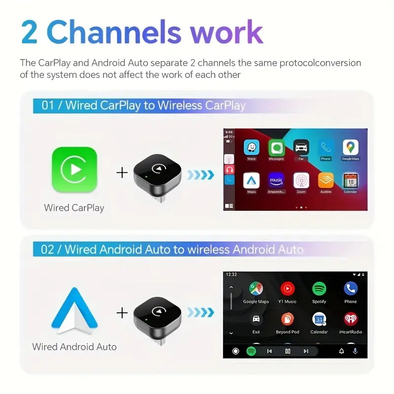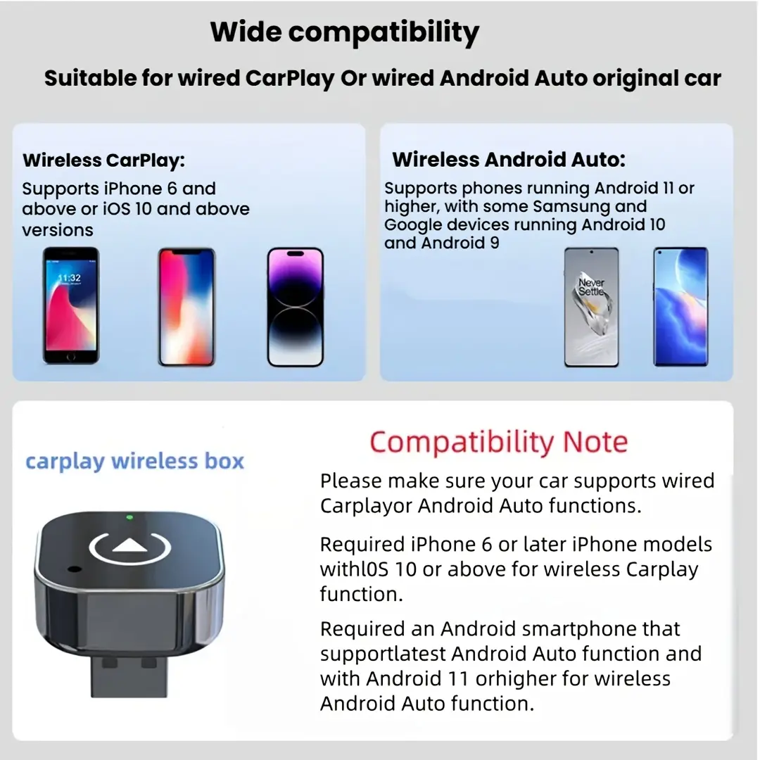 Compatibility Notes: Please ensure your vehicle supports wired CarPlay or Android Auto. For iPhone 6 and later models, wireless CarPlay with iOS 10 or later is supported. Requires an Android smartphone that supports the latest Android Auto features and is running Android 11 or later for wireless Android Auto functionality.