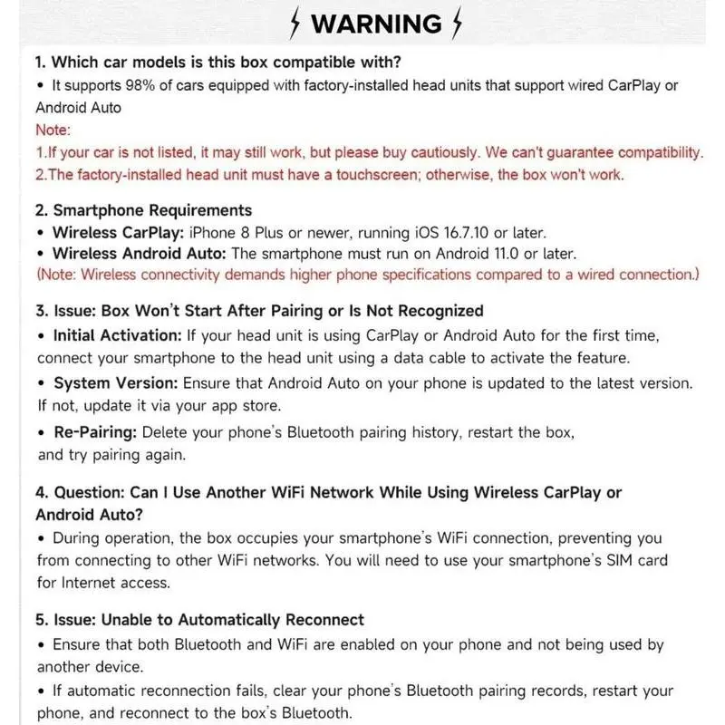 4.To use this product,your car must have built-in wired CarPlay or Android Auto.