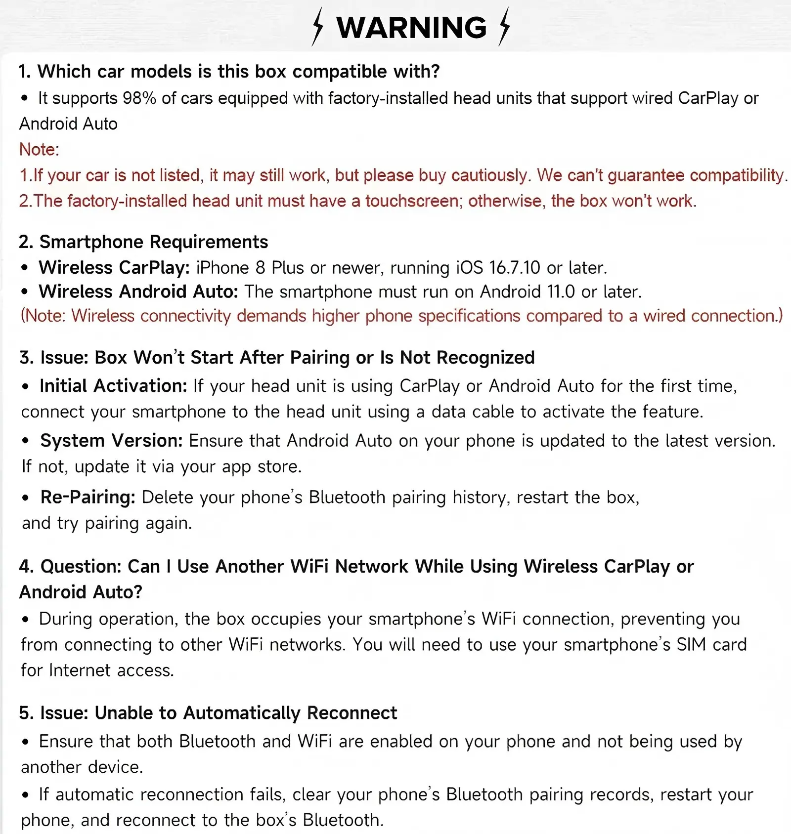 3.The product does not support screen mirroring.4.To use this product, your car must have built-in wired CarPlay orAndroid Auto.