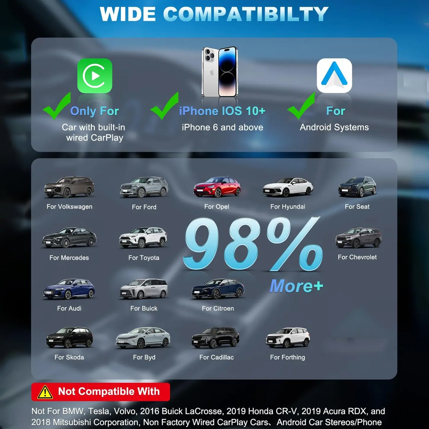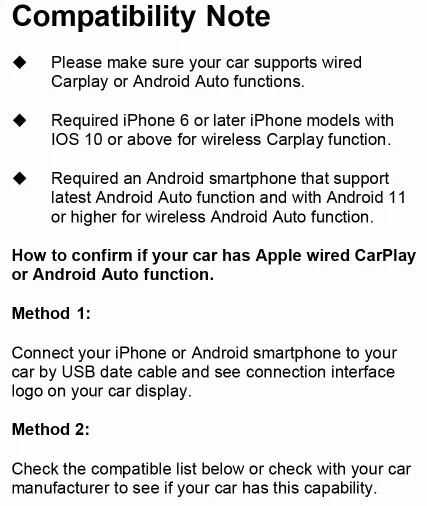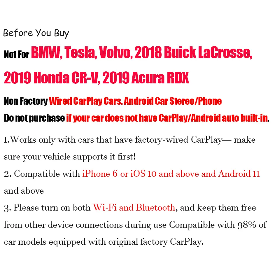 [Universal Compatibility] – Compatible with 98% of factory CarPlay systems and for iPhone running iOS 10 or later, our adapter comes with both USB and USB-C plug options to fit virtually any vehicle port. 𝐖𝐀𝐑𝐌 𝐍𝐎𝐓𝐄: It can only work on 𝐜𝐚𝐫𝐬 𝐰𝐢𝐭𝐡 𝐰𝐢𝐫𝐞𝐝 𝐜𝐚𝐫𝐩𝐥𝐚𝐲 𝐟𝐮𝐧𝐜𝐭𝐢𝐨𝐧𝐬 𝐚𝐟𝐭𝐞𝐫 𝟐𝟎𝟏𝟔. In addition, the carplay wireless adapter 𝐝𝐨𝐞𝐬 𝐧𝐨𝐭 𝐬𝐮𝐩𝐩𝐨𝐫𝐭 𝐘𝐨𝐮𝐓𝐮𝐛𝐞 𝐚𝐧𝐝 𝐍𝐞𝐭𝐟𝐥𝐢𝐱 𝐯𝐢𝐝𝐞𝐨 playback, mainly for driving safety.(𝐍𝐨𝐭 𝐂𝐨𝐦𝐩𝐚𝐭𝐢𝐛𝐥𝐞 𝐰𝐢𝐭𝐡 𝐢𝐎𝐒 𝟏𝟖.𝟒.𝟎, 𝐏𝐥𝐞𝐚𝐬𝐞 𝐔𝐩𝐝𝐚𝐭𝐞 𝐭𝐨 𝐢𝐎𝐒 𝟏𝟖.𝟒.𝟏 𝐨𝐫 𝐚𝐛𝐨𝐯𝐞!)
