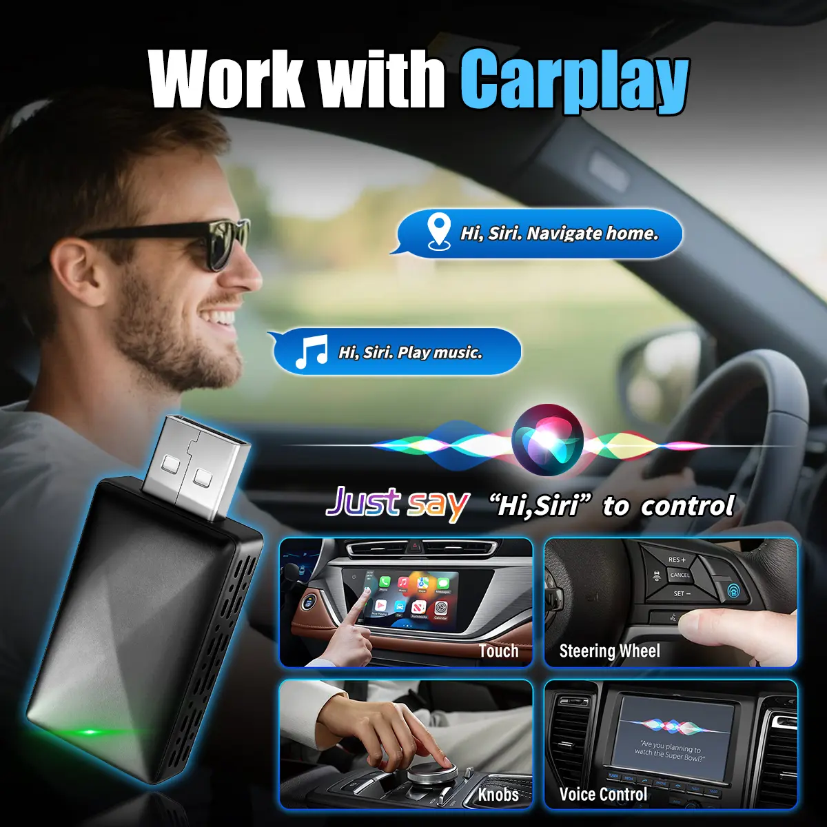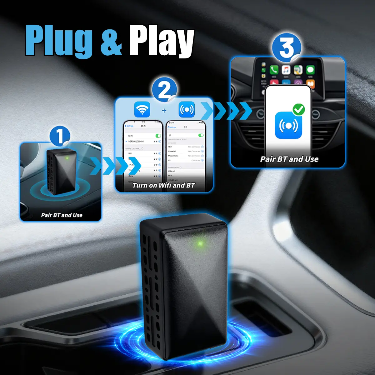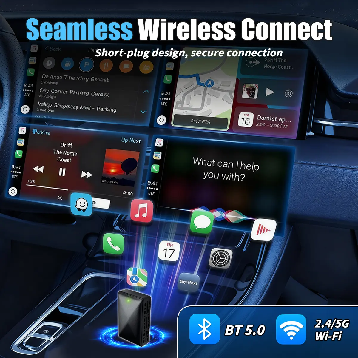 Instantly convert wired CarPlay to wireless. Keep all original controls: steering wheel buttons, touchscreen, and voice assistant, plus hands-free calls.(The product itself does not contain any APP.)