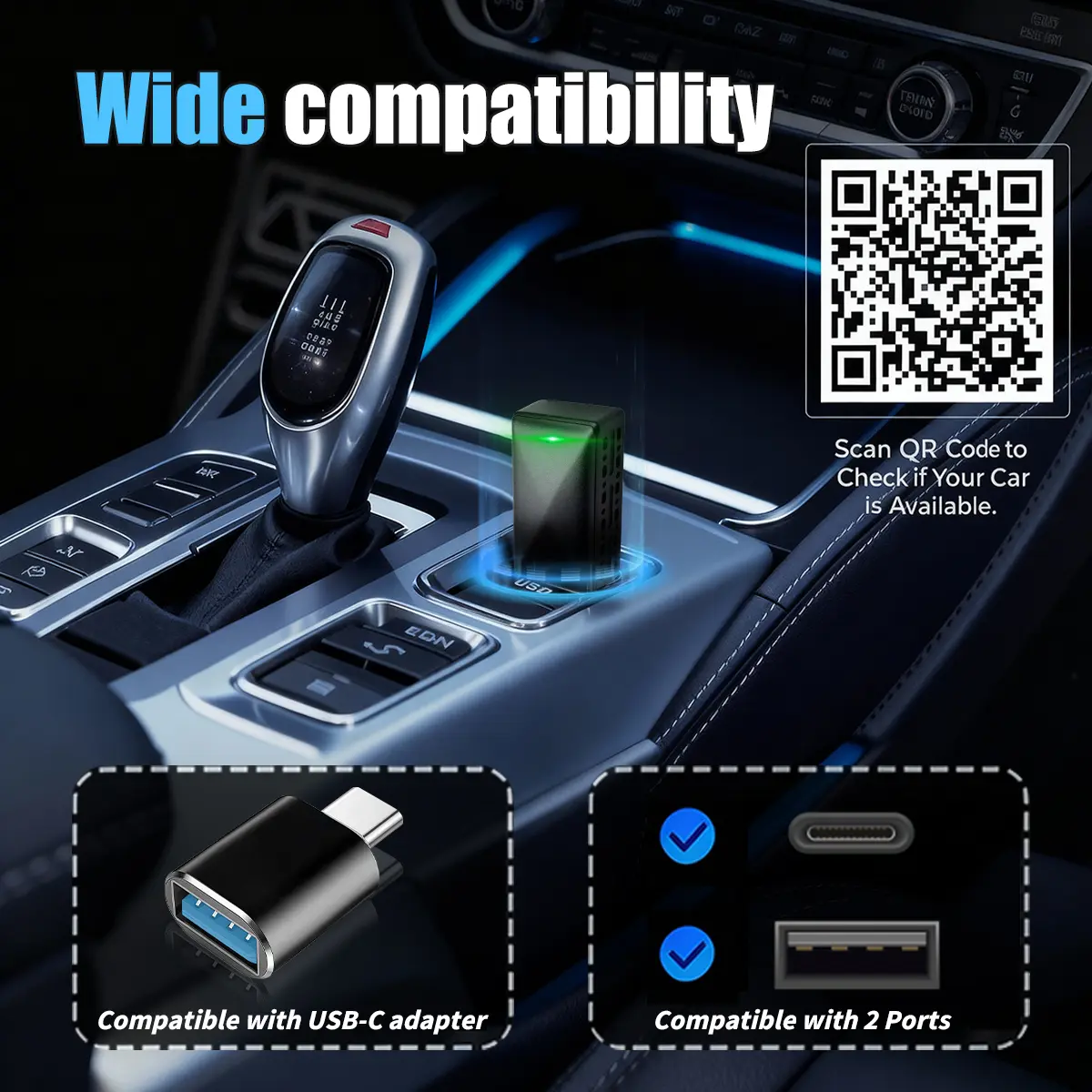 Featuring a mini metal body with USB-C adapter, this compact adapter fits most 2016+ cars. (Scan to confirm compatibility before purchase; avoid buying if not supported.)