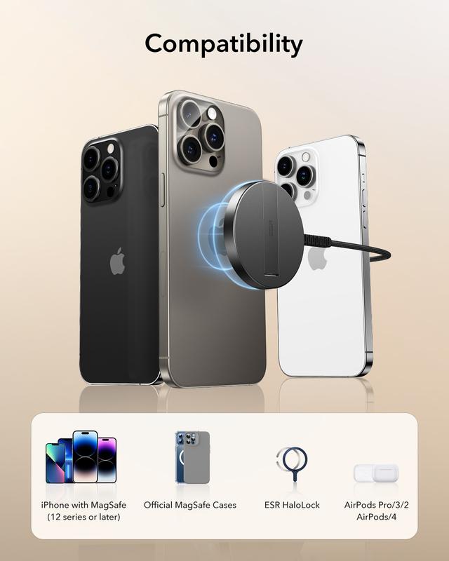 Tired of juggling your phone while it charges? The ESR MagSafe Charger with Kickstand is here to simplify your life. Designed for iPhone 12 through 15 and compatible AirPods, this 15W wireless charger delivers fast, reliable power with a strong magnetic pad that keeps your device perfectly aligned. Whether you're catching up on family FaceTime or streaming videos, the built-in kickstand lets you watch hands-free without interrupting your charging session. The included 5 ft USB-C cable gives you the freedom to move around, or you can go cable-free with the sleek, durable aluminum stand. Plus, with detailed setup videos and a 12-month protection plan, you’re fully supported from day one. Ready to charge smarter and stay connected? Grab this stylish wireless charger and keep your devices powered up with ease.