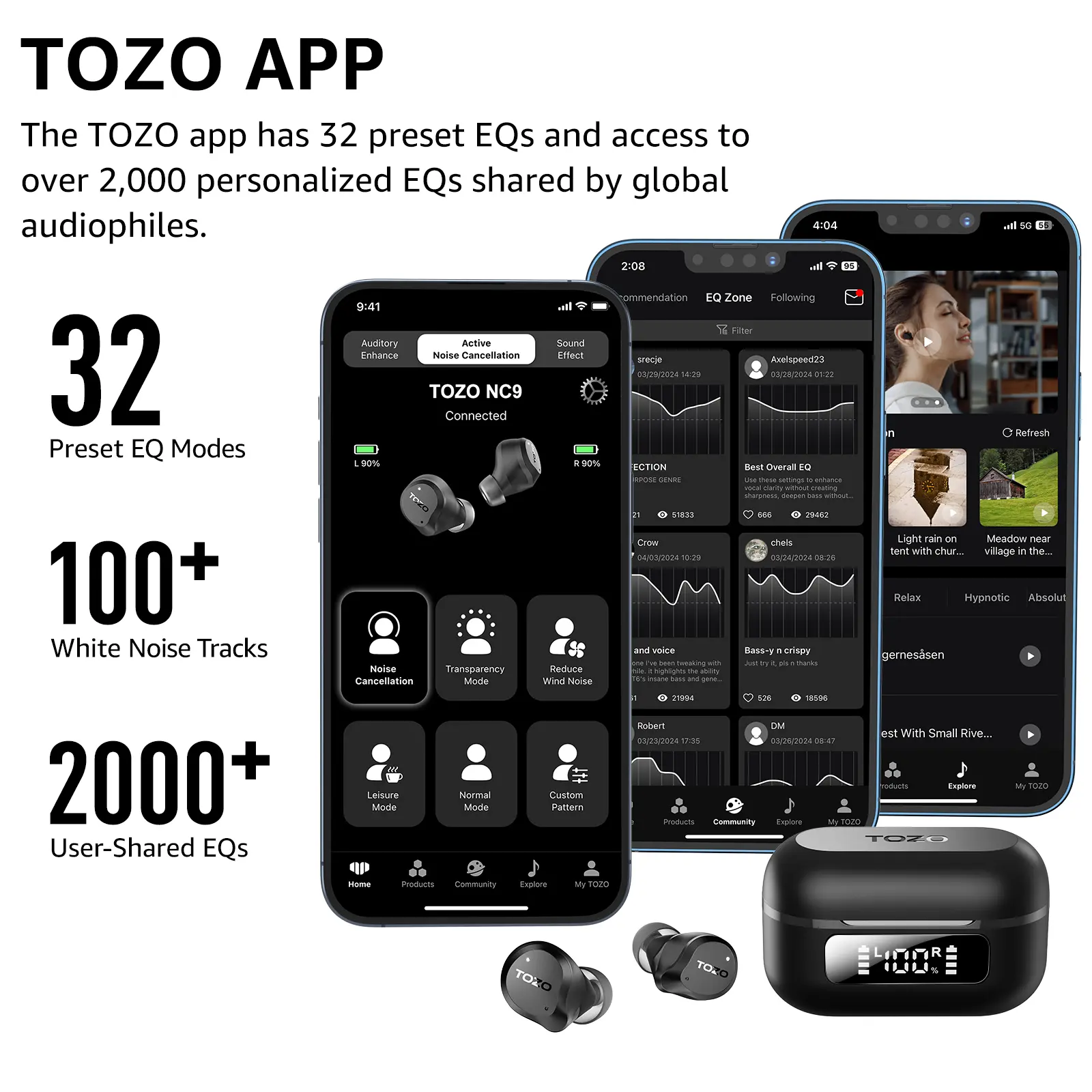 Tailor the sound with the TOZO app further, which allows you to adjust bass levels, music style, and noise cancellation modes to your liking, and experience the joy of sharing your customized EQ with global audiophiles in 'EQ zone'.