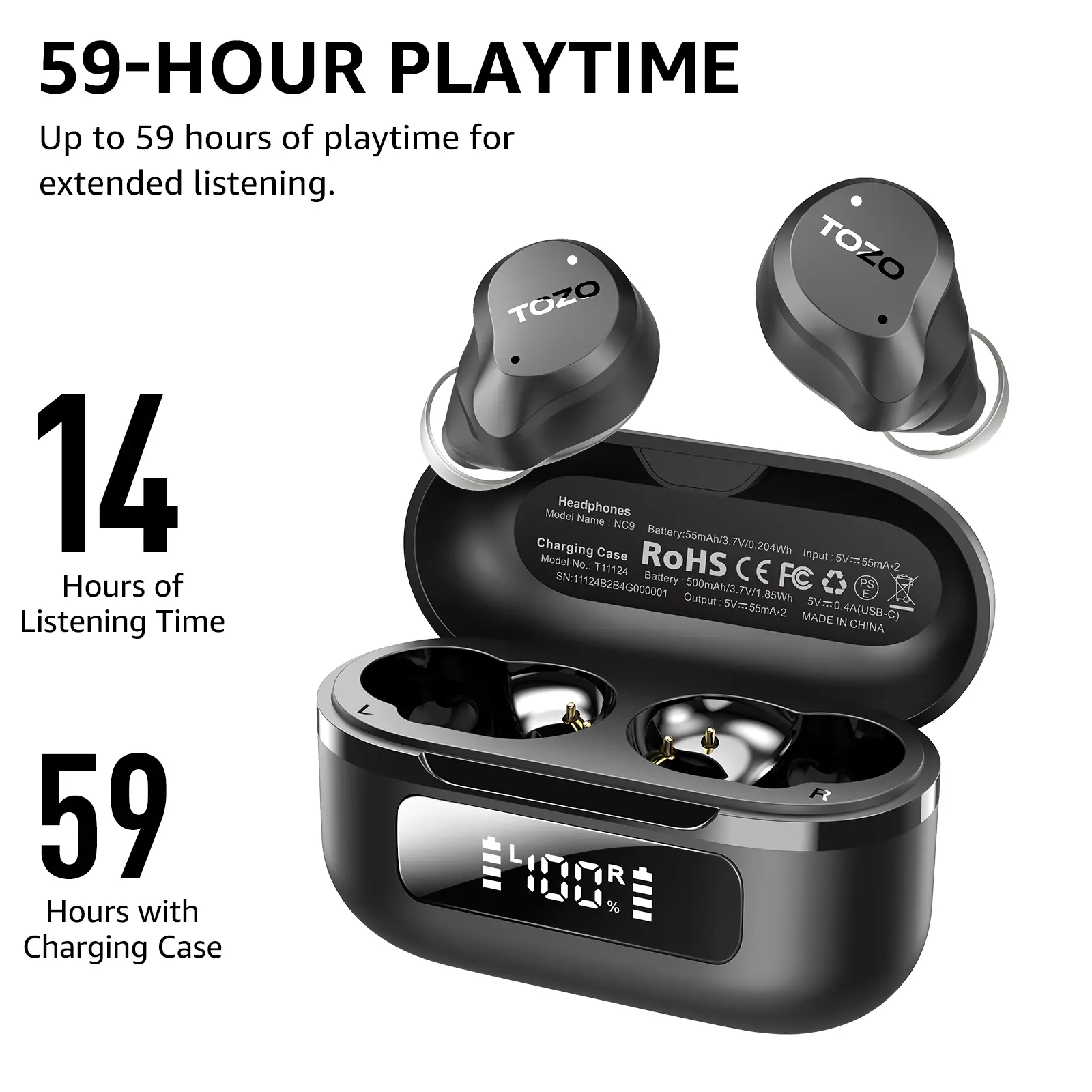 The charging case not only serves up to 59H(ANC off) and 42H(ANC on) totally playtime after 2 hrs fully charge, and 14hrs(ANC off) and 10hrs(ANC on) playback for single use. It also displays the remain battery, ensuring it's still there when you need it most.
