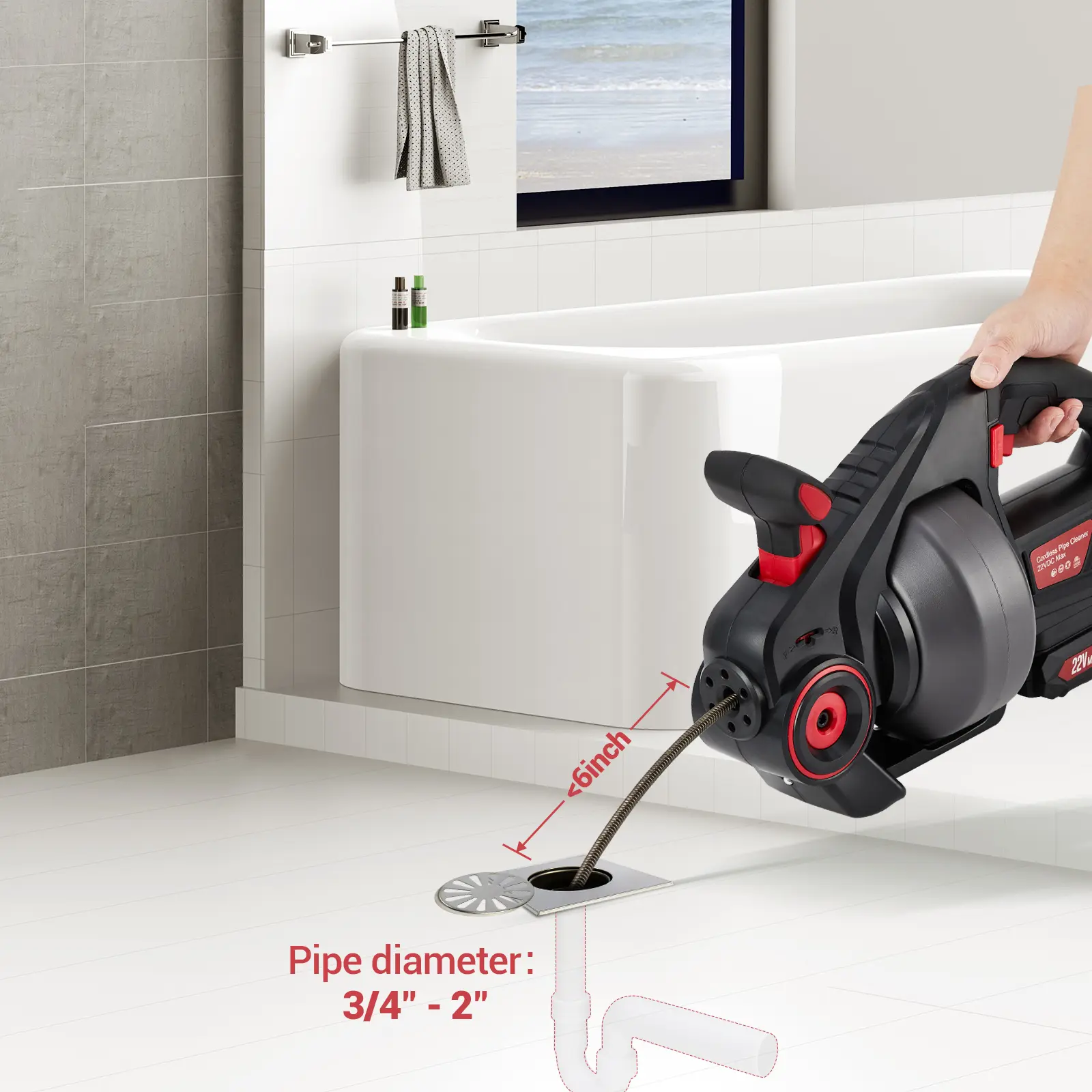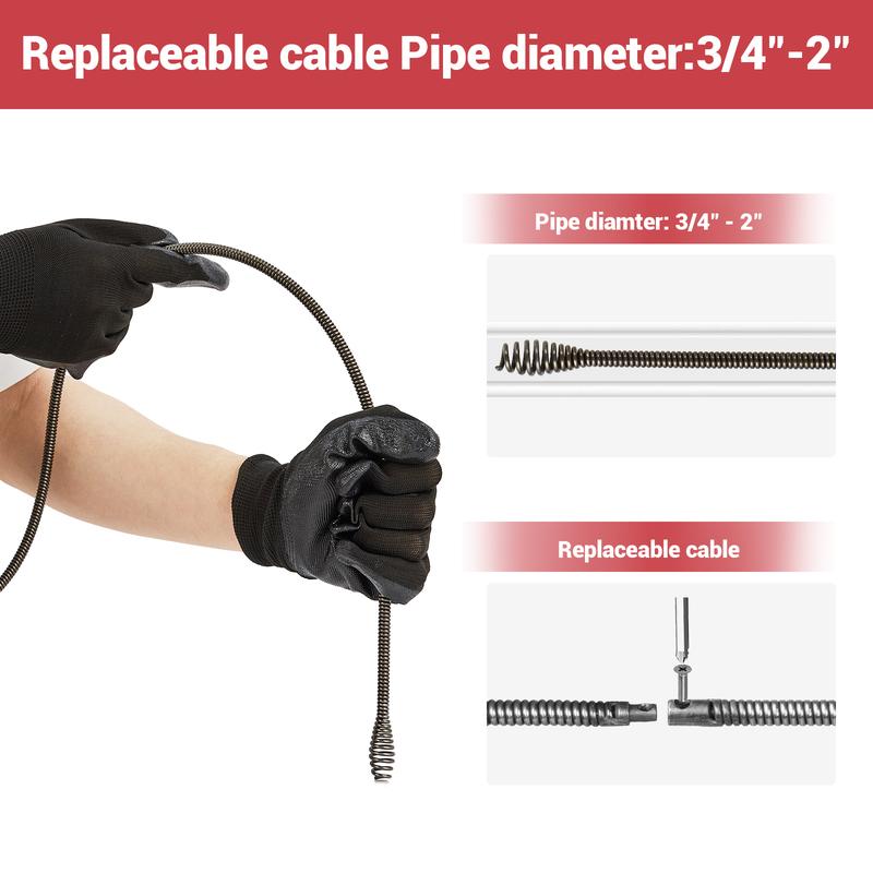 Clear tough blockages in toilets, sinks, showers, and sewer pipes with our advanced wire-free Electric Drain Auger, designed to tackle pipe diameters from 3/4" to 2" efficiently. Featuring a robust 25 ft flexible cable, this powerful plumbing snake easily navigates complex L-, U-, and S-shaped pipes, reaching deep-seated clogs in hard-to-access areas.