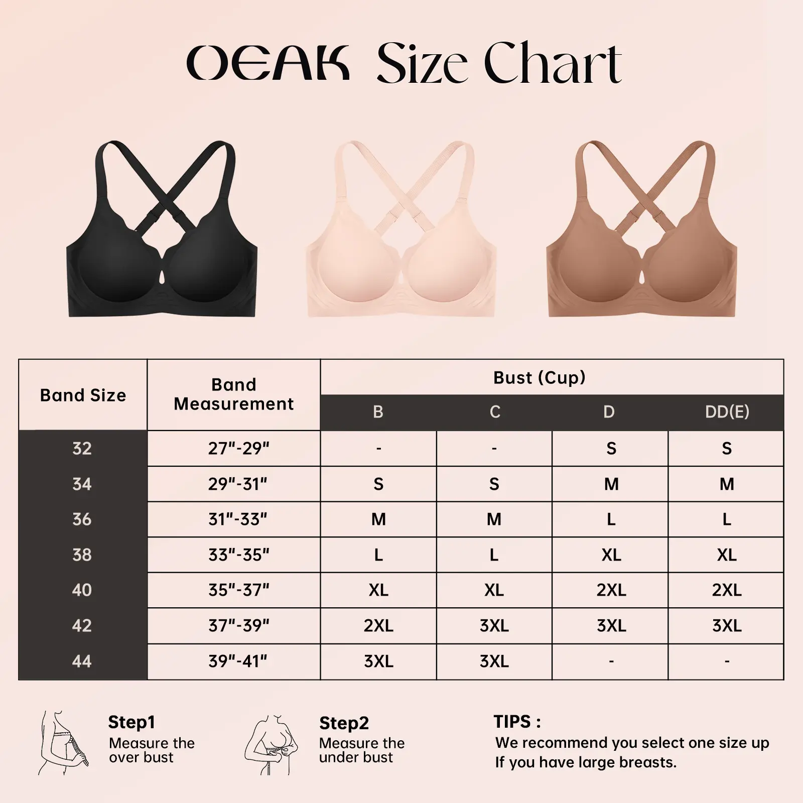 ·Bras for Women Full Coverage: Available in S-3XL, this bra includes a free extender for extra adjustability, ensuring a secure fit that adapts to breast and waistline changes.S: 32D, 32DD(E), 34B, 34C; M: 34D, 34DD(E), 36B, 36C; L:36D, 36DD(E), 38B, 38C; XL: 38D, 38DD(E), 40B, 40C; 2XL: 40D, 40DD(E), 42B, 42C; 3XL:42D, 42DD(E), 44B, 44C