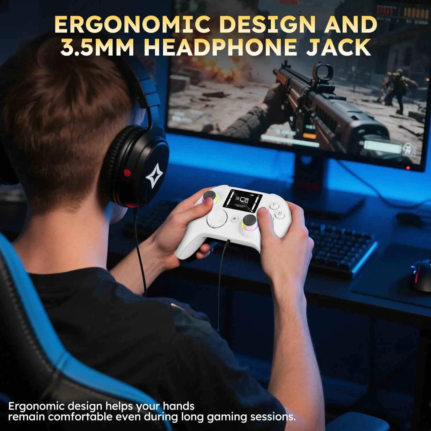 ·【Long Battery Life】The PC gaming wireless controllers equipped with a 1000mAh battery that fully charges about 2–3 hours, provide 10-15 hours of continuous gameplay. The LCD screen features a low battery function, which remind you to charge your device promptly, make ensure worry-free gaming.Superior ergonomics practically makes it melt into your hand for hours of comfortable gaming.