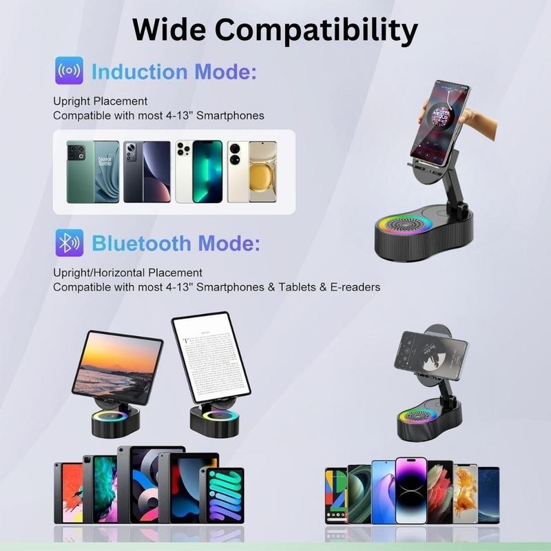 ·Wireless Induction Speaker: Induction mode for instant music playback by placing your phone on the stand. Uses the latest Bluetooth 5.3 technology for lower power consumption, faster transmission, stable signal, and no delay. Enjoy shocking sound effect, strong bass, tight mid-range, and clear treble.