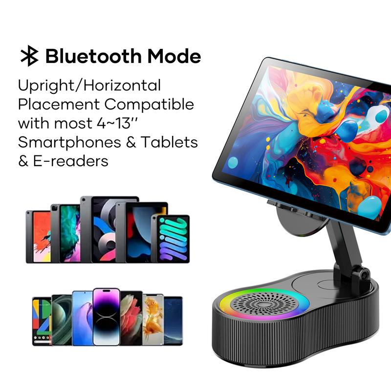 Wireless Induction Audio Bluetooth Speaker 5in1 Phone Holder Emergency Rechargeable 3000mAh with Colorful Ambient Light 300° Foldable for Tablets iPhone Android Stereo Charging Compact Device