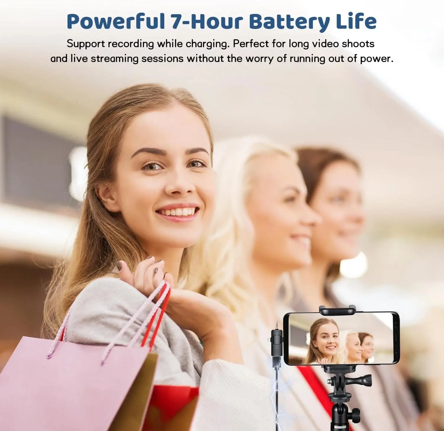 3.Long-lasting Battery Life: Equipped with a powerful 7-hour battery, this wireless microphone allows you to record uninterrupted for extended periods. Most importantly this mini mic support recording while charging. Perfect for long video shoots and live streaming sessions without the worry of running out of power.