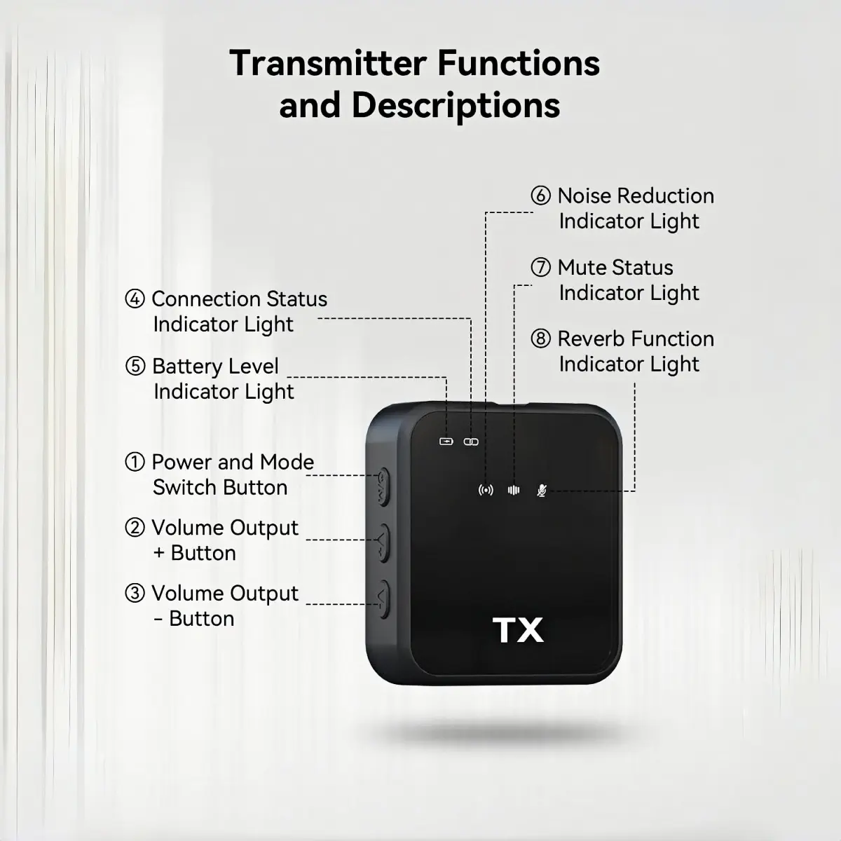 ·Stable 2.4G Transmission – Uses 2.4G wireless technology for a stable connection with low latency. Supports wireless transmission distance up to 328ft (100m) under open conditions. Includes reverb and mute functions for flexible use.