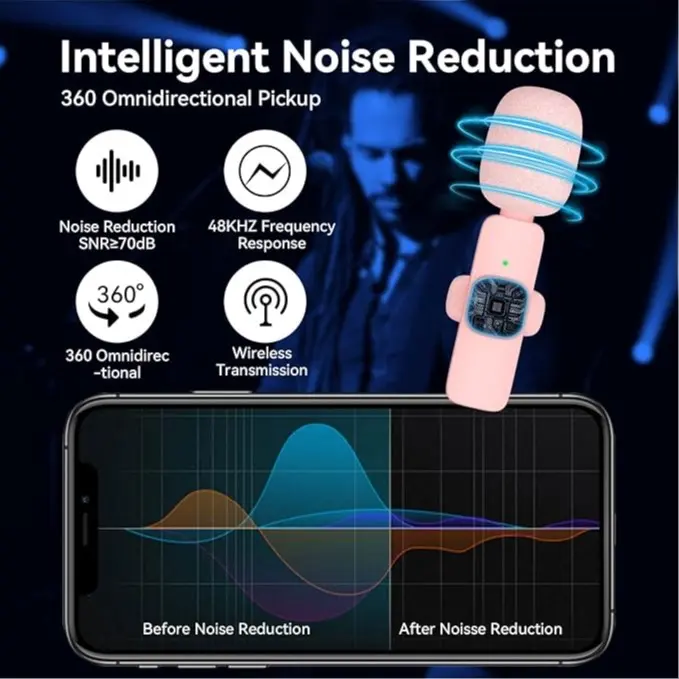 ·【UNIVERSAL WIRELESS MIC】The Reciever Powered by Phones, the Trasmission Micphone Built in Rechargeable Batteries Up to 8 hours Operation Time. 80M Working Distance without obstacle & Cable.0.009s Delay in Transmission.