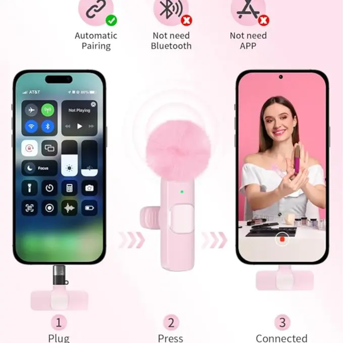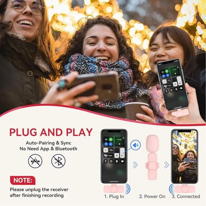 ·Automatic Pairing & Plug and Play】: This innovative clip-on microphone is easier to use than other microphones. Step 1: Just plug the receiver into your iPhone/iPad device; Step 2: Turn on the power switch of the microphone, The two parts will pair automatically without adapters, extra apps and bluetooth.