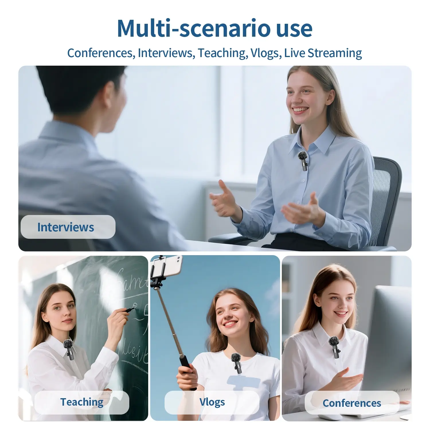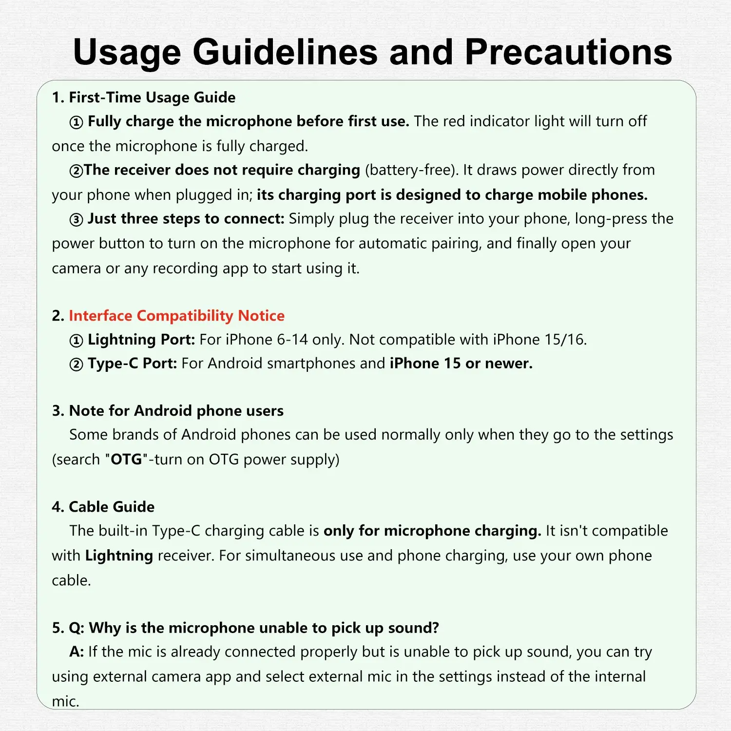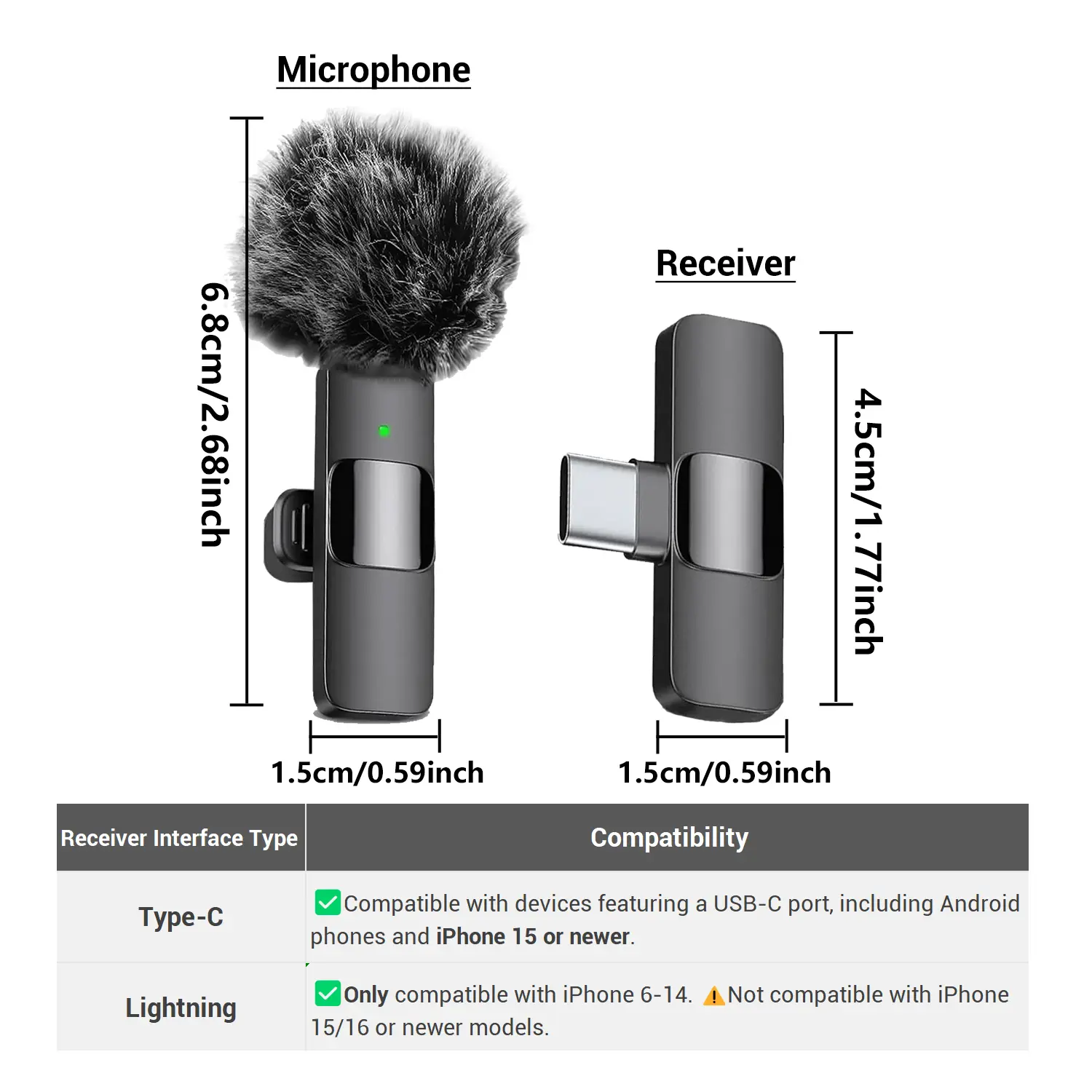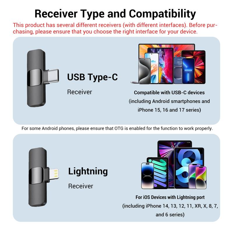 Ever struggled with bulky microphones or tangled cords during your video shoots or podcasts? This professional wireless lavalier microphone is here to simplify your recording life. Designed for iPhone (6-14 and 15+) and Android devices with USB-C, it offers plug-and-play ease—no apps or Bluetooth fuss needed. The omnidirectional condenser mic picks up your voice clearly from every angle, while the built-in intelligent noise reduction chip cuts out background noise for crisp, professional sound. Whether you're teaching, vlogging, interviewing, or live streaming, the lightweight clip-on design keeps you hands-free and comfortable all day. Plus, with support for two mics at once, you can capture multiple voices seamlessly. The mic runs up to 4 hours on a single charge, and the receiver doubles as a phone charger, so you stay powered up on the go. Just remember to enable OTG on some Android devices for smooth compatibility. Inside the box, you get the wireless mic, receiver, charging cables, and clip—all you need to start recording like a pro. Ready to upgrade your audio game? Grab this wireless lavalier mic and make every word sound amazing!