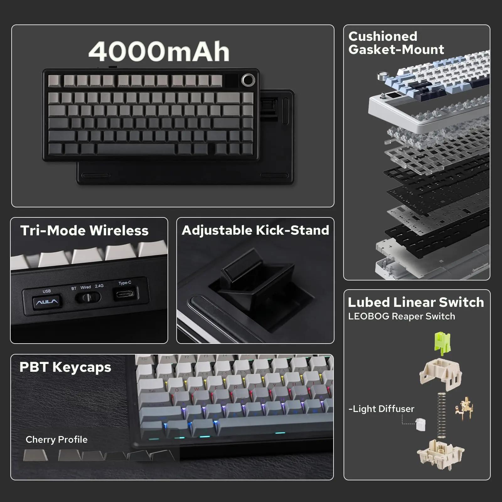 ·Custom Keyboard with Compatibility: As personalization being our core branding, our F75 Max isn’t shy in the realm of customization. With south-facing per-key LEDs and light diffusers on the Reaper switches, the RGB Backlight shines brightly with pre-set dynamic effect, adjustable in color and style via software, screen and shortcut. The hot-swappable F75 MAX comes with plate-mount stabilizers but is compatible with 3/5-pin mechanical switches and screw-in stabilizers for experimenting typing feel and sound, while the software offers key remapping and macro editing for efficiency and accessibility