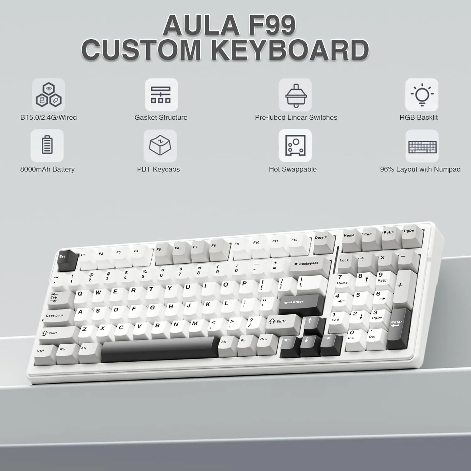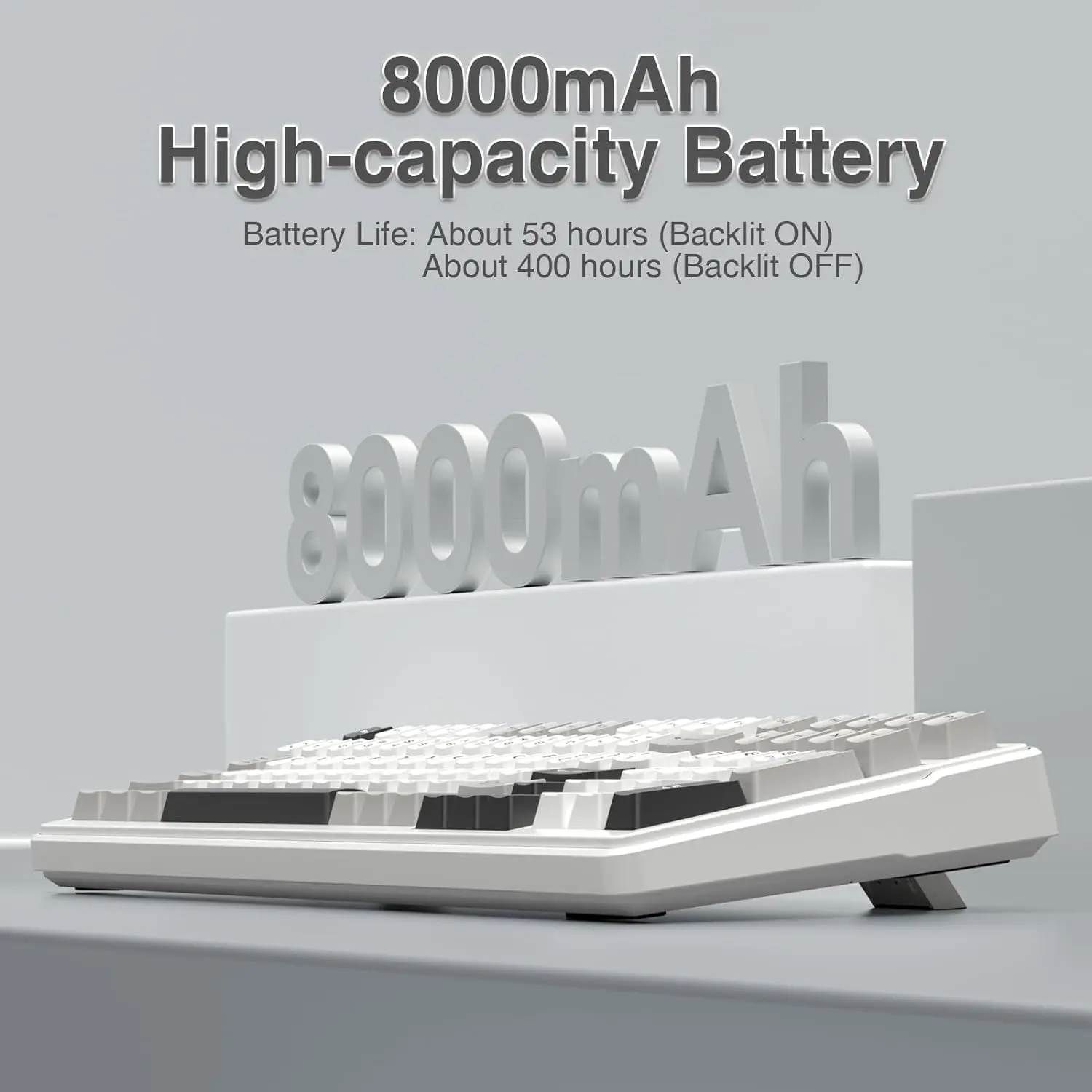 ·PBT Keycaps and 8000mAh Battery: 99 keys 96% layout compact keyboard can save more desktop space while keep necessary arrow keys and number area for games and work. The rechargeable keyboard built-in 8000mAh large capcacity battery to provide more power and longer battery life. Double shot PBT keycaps, made from two colors material molded into each others, make the keycaps characters maintain the vibrance and saturation, clear and not fade