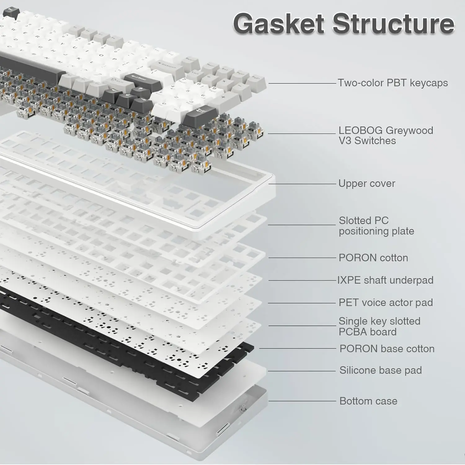 ·Gasket Structure and PCB Single Key Slotting: This computer keyboard features a gasket structure, extended integrated silicone pad, and PCB single key slotting, better optimizes resilience and stability, making the hand feel softer and more elastic. Five layers of filling silencer fills the gap between the PCB, the positioning plate and the shaft,effectively counteracting the cavity noise sound of the shaft hitting the positioning plate, and providing a solid feel