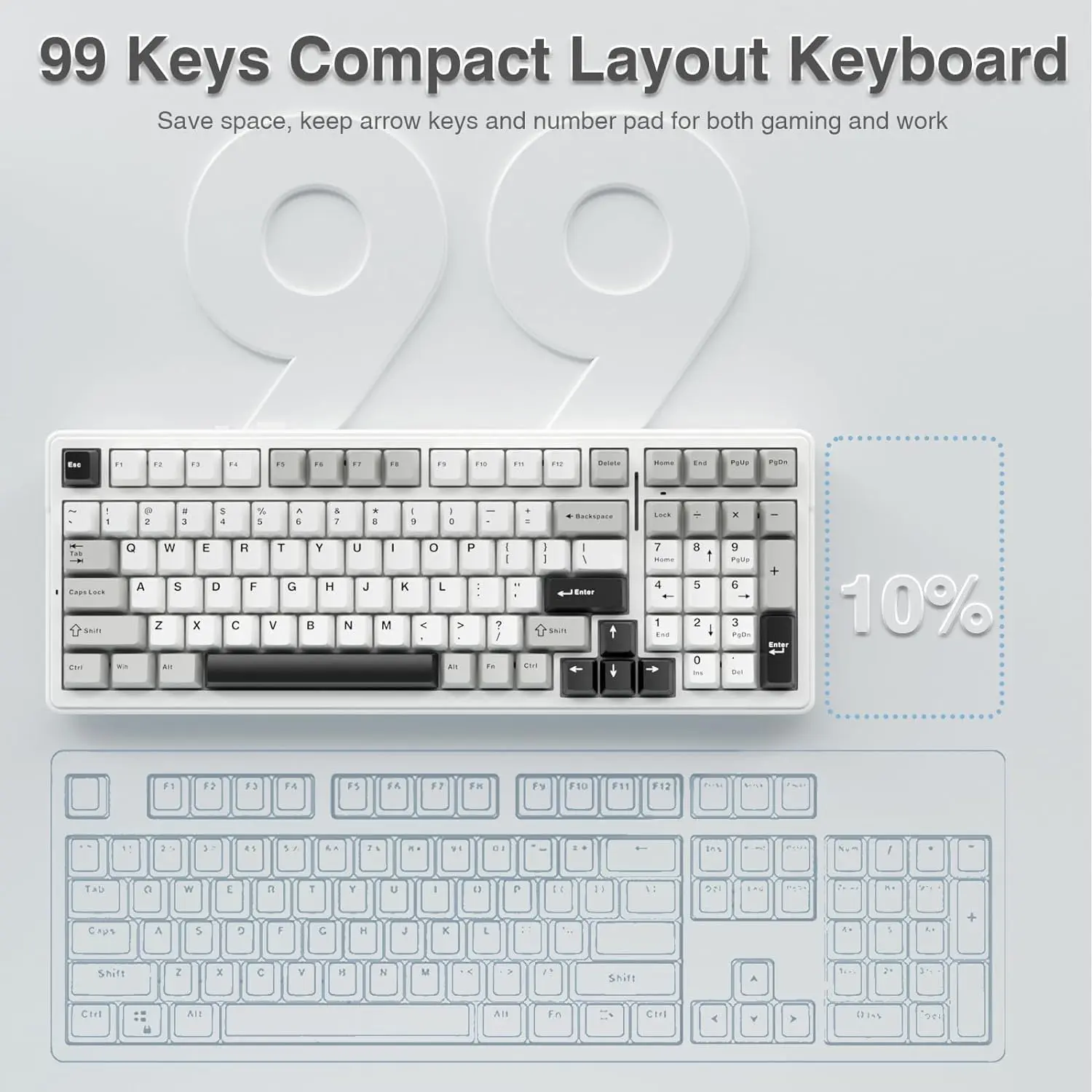 99-key streamlined layout,can save more space on the desk, and keep the arrow keys and numpad which are necessary for gaming and work.