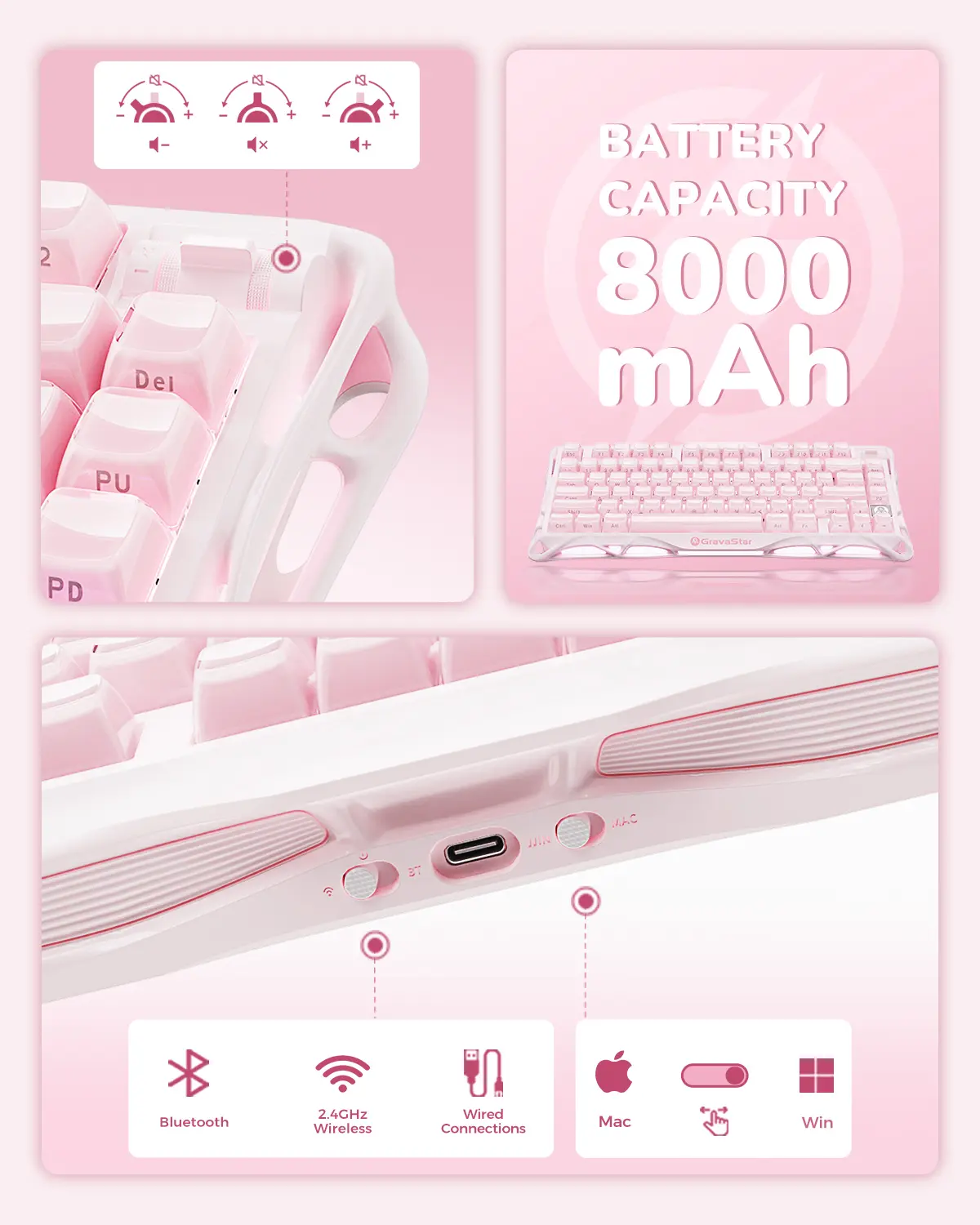 Experience hours of RGB runtime with the massive 8000mAh battery. The Mercury K1 supports wired USB-C, Bluetooth 5.0, and 2.4GHz wireless connections, allowing seamless switching between devices. Its compatibility with both Windows and Mac systems ensures versatility across various setups.