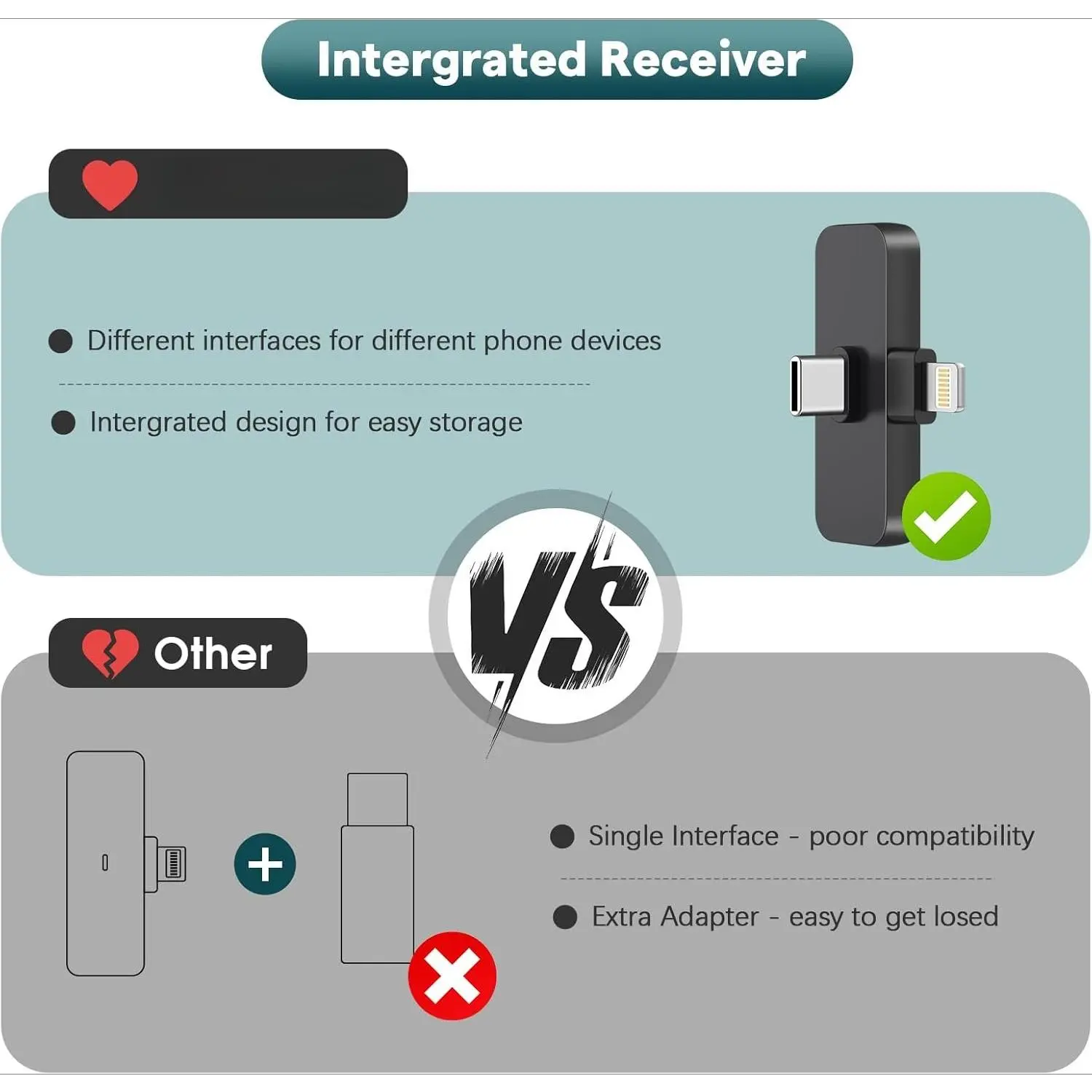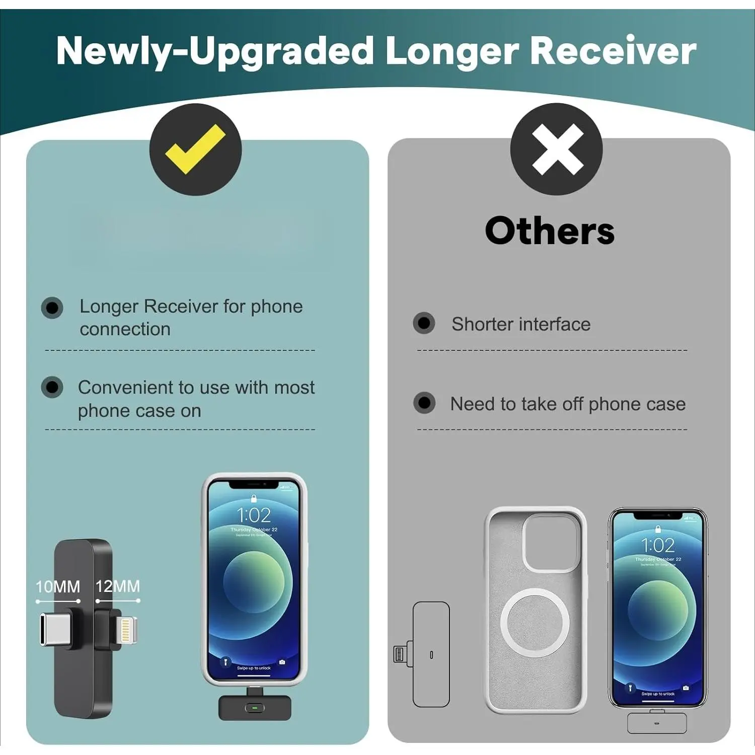 Longer Receiver: The interface of the receiver for the mini microphone has been upgraded to be longer for phone connection. Compared with other wireless microphones, this one has the advantage of using together with most of the phone cases. In other words, for youtube or tiktok influencers or online celebrities on other social media platforms, they don’t have to take off the phone case before making audio or video recordings, which is a very user-friendly design that allows people to do vlogging, livesteaming filming or online teaching, video conference while your phone can be protected