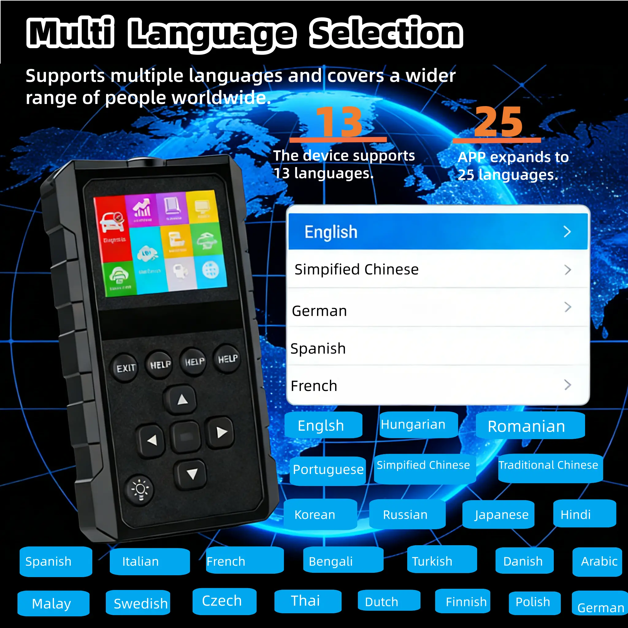 ·⑤ Multilingual Support | Global Usable OBD2 Scan Tool The obd2 scanner diagnostic tool has 13 built-in languages (Chinese, English, German, Spanish, Japanese, etc.), and the matching App can be expanded to 25 languages—this scanner para autos breaks language barriers, making easy operation for users from all countries, a must-have car tool for global car lovers.