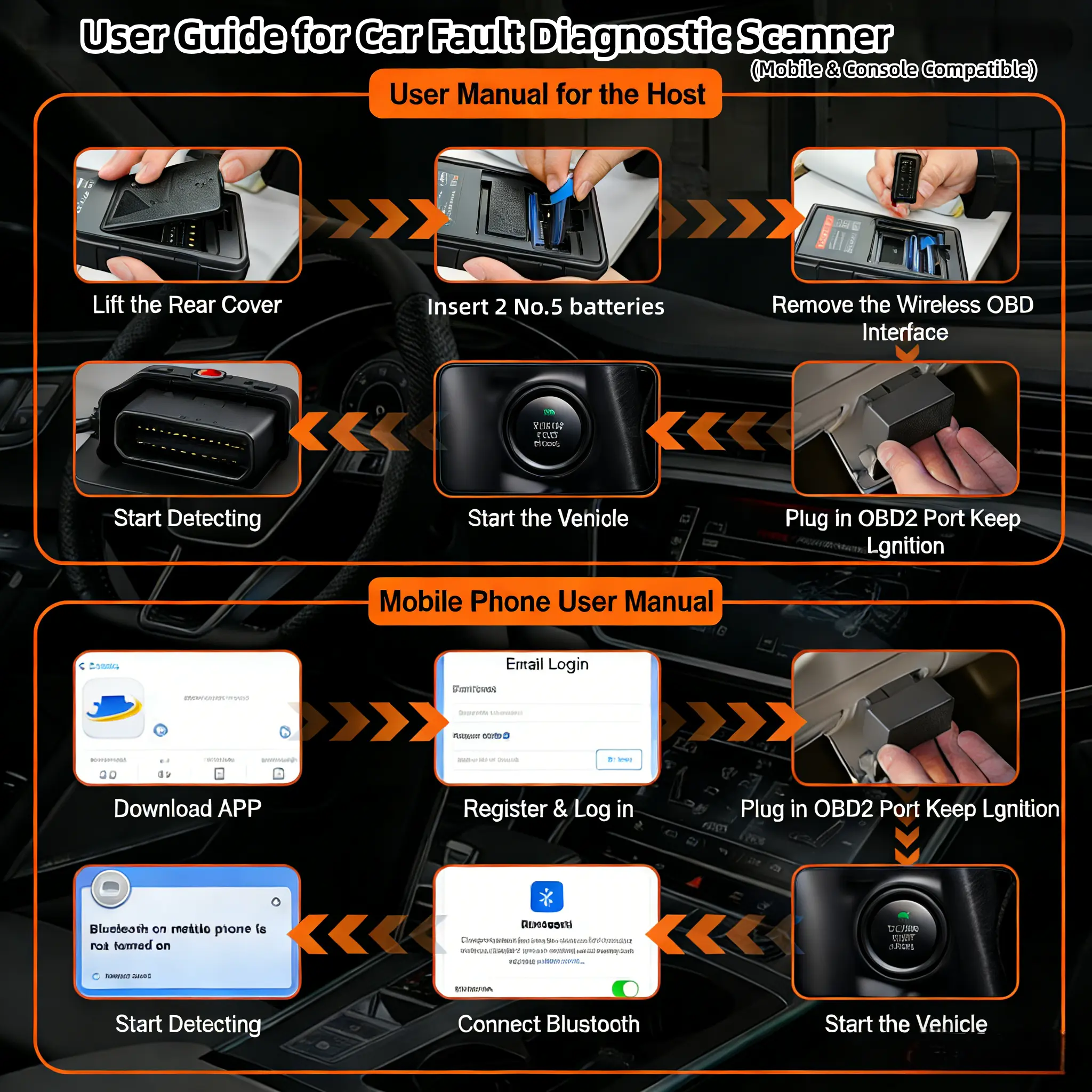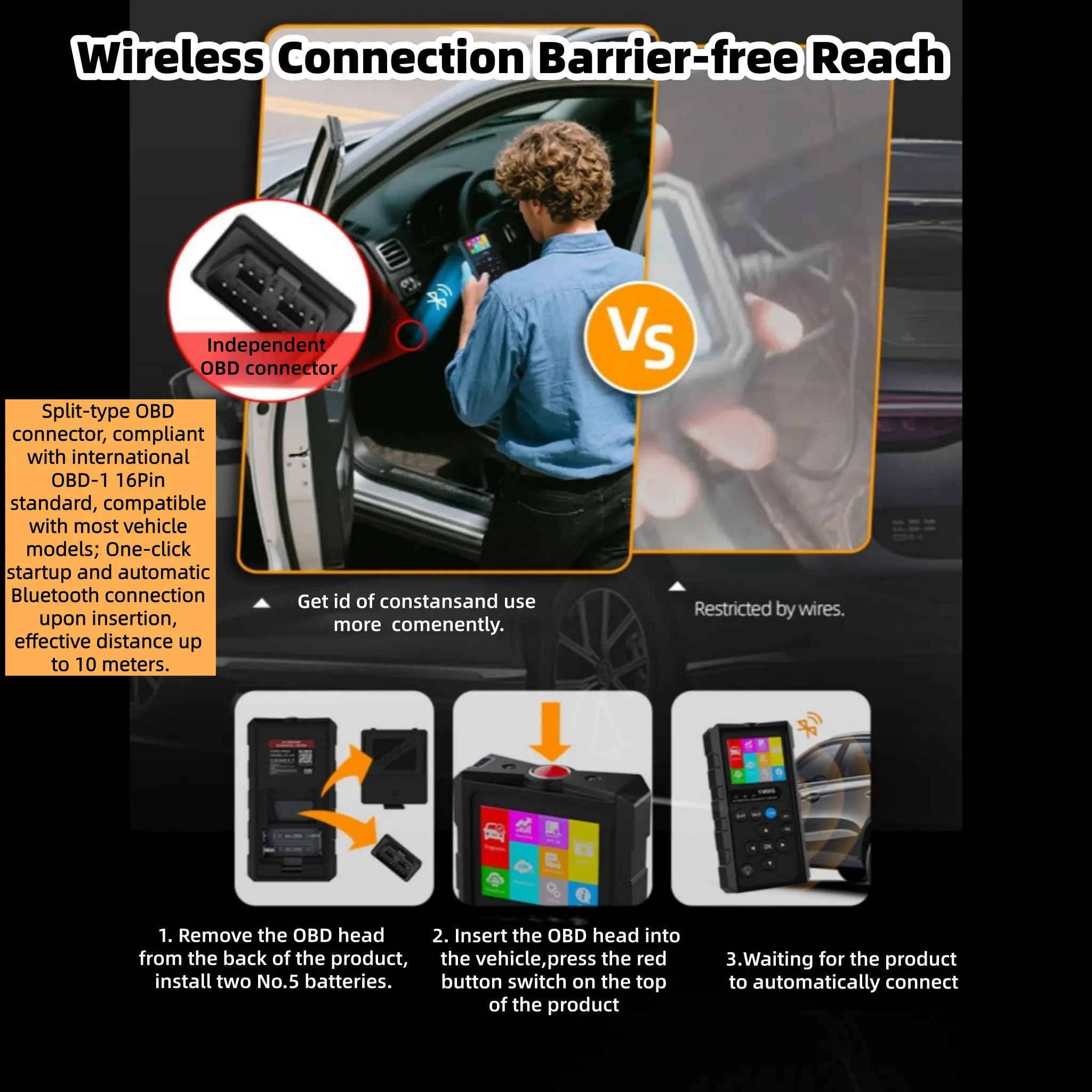 ·② True Wireless Connectivity | Cordless OBD Scanner for Flexible Operation Say goodbye to messy cables with this wireless obd2 scanner! Just load 2 AA batteries (not included), take out the detachable OBD module, plug it into your car’s 16-pin OBD2 port (ignition on), start the vehicle and launch diagnostics on the screen—this car scanner lets you read real-time vehicle data instantly, no cable limitations at all.