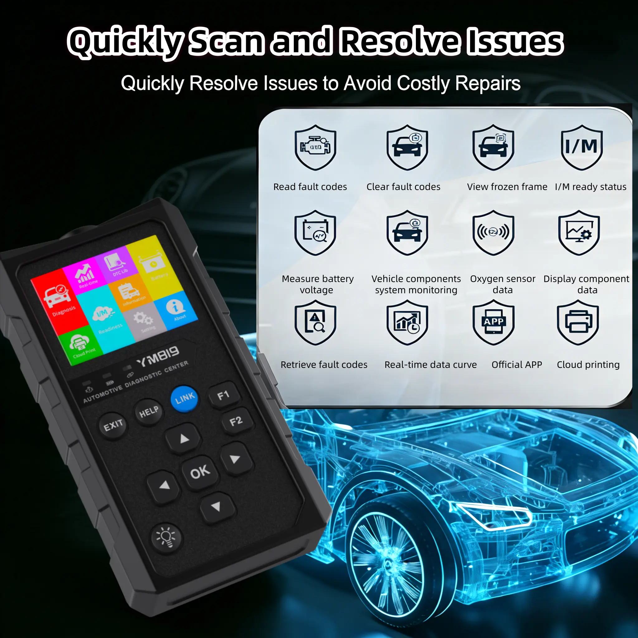 ·③ Exclusive Free Mobile App | Smart Car Code Reader with App Sync The YM819 obd2 scanner comes with a dedicated YMOBD App for Android & iOS. Pair the code reader for cars and trucks with your phone via Bluetooth, and you can view, save, print detailed diagnostic reports or send them to technicians for professional advice—this car code reader and reset tool makes vehicle maintenance ultra-convenient.