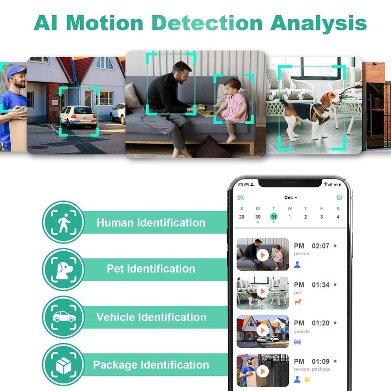 ·AI Recognition Motion Detection: The AI PIR sensor will be triggered in real-time and push notifications and alerts to your phone app once this security camera detects motion.