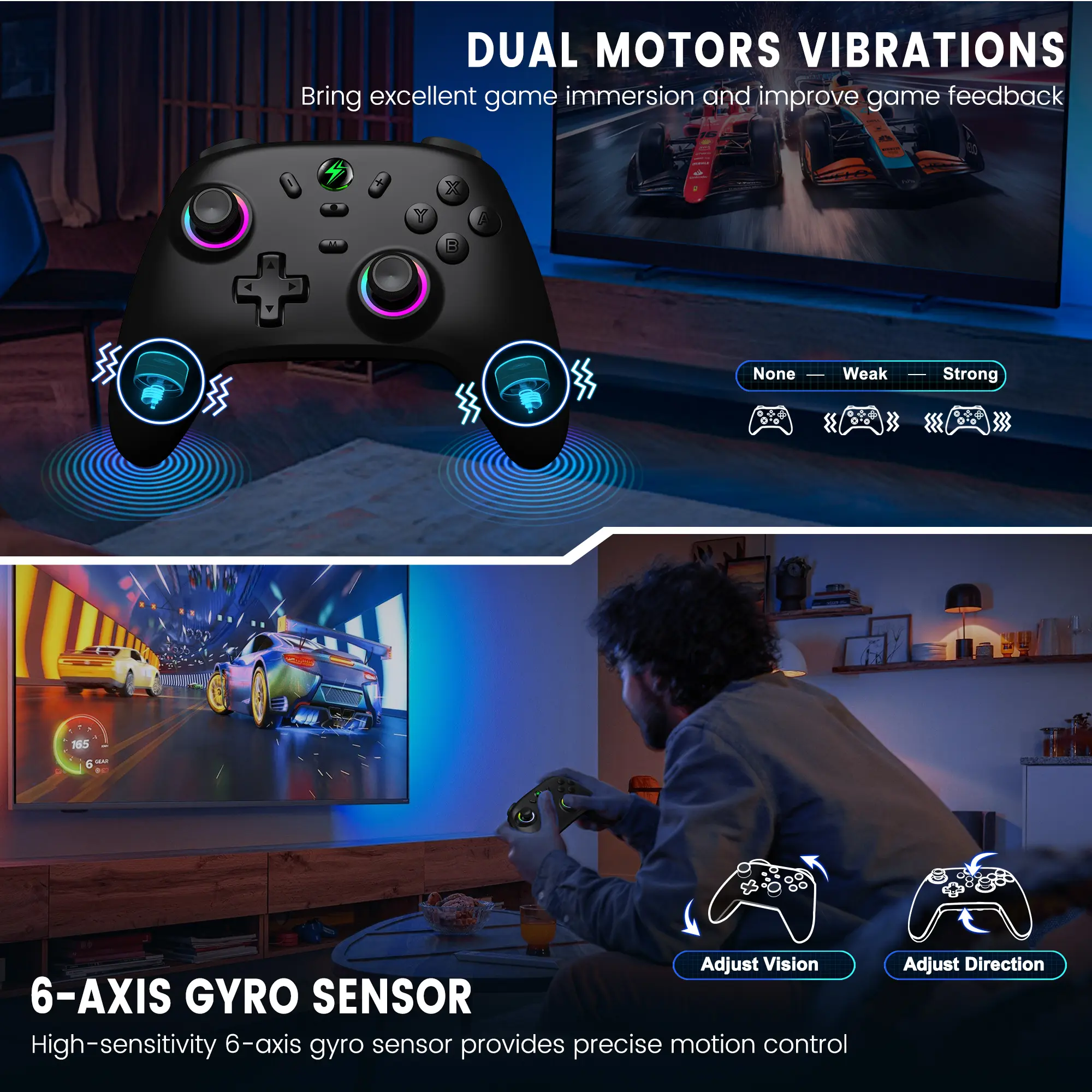 【6-AXIS GYRO MOTION CONTROL & DOUBLE SHOCK WIRELESS SWITCH CONTROLLER】 The switch controller has 6-AXIS gyro sensor and precise motion control, which will make your operation more precise and easier in the game. Nintendo pro controller has dual vibration motors with 3 levels adjustable vibration (Strong/Weak/None) , which will enhance the game immersion, provide you realistic and stimulated gaming experience