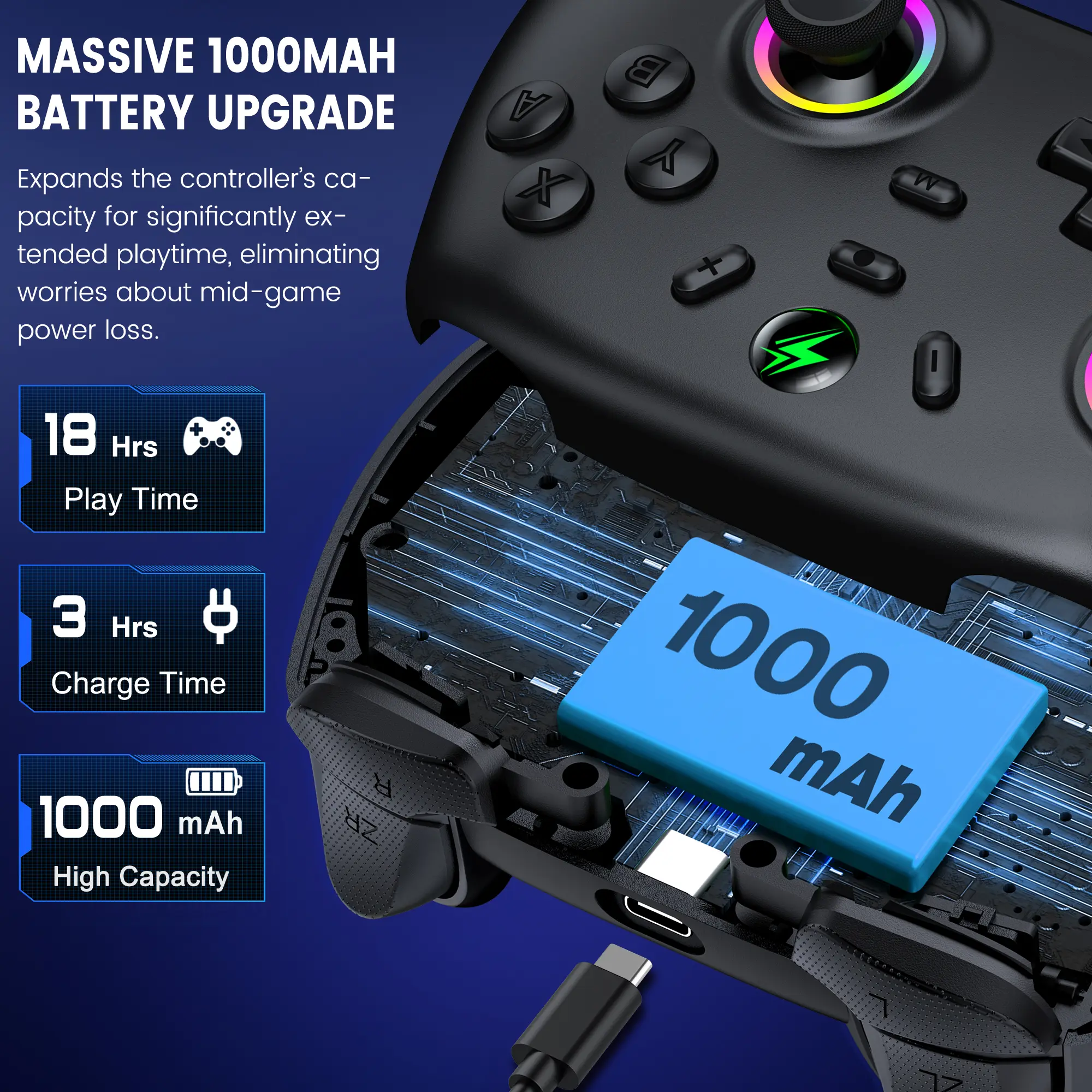 【SWITCH CONTROLLER WITH CHARGING DOCK & USB RECEIVER】The controller is equipped with a charging base, which can be used for charging and storing the controller. Instant charging, simple and fast. 1000mAh high capacity battery provides over 18 hours game playing, and it can be fully charged within 3 hours. The charging dock comes with a USB receiver that can be plugged into a PC host for wireless connection