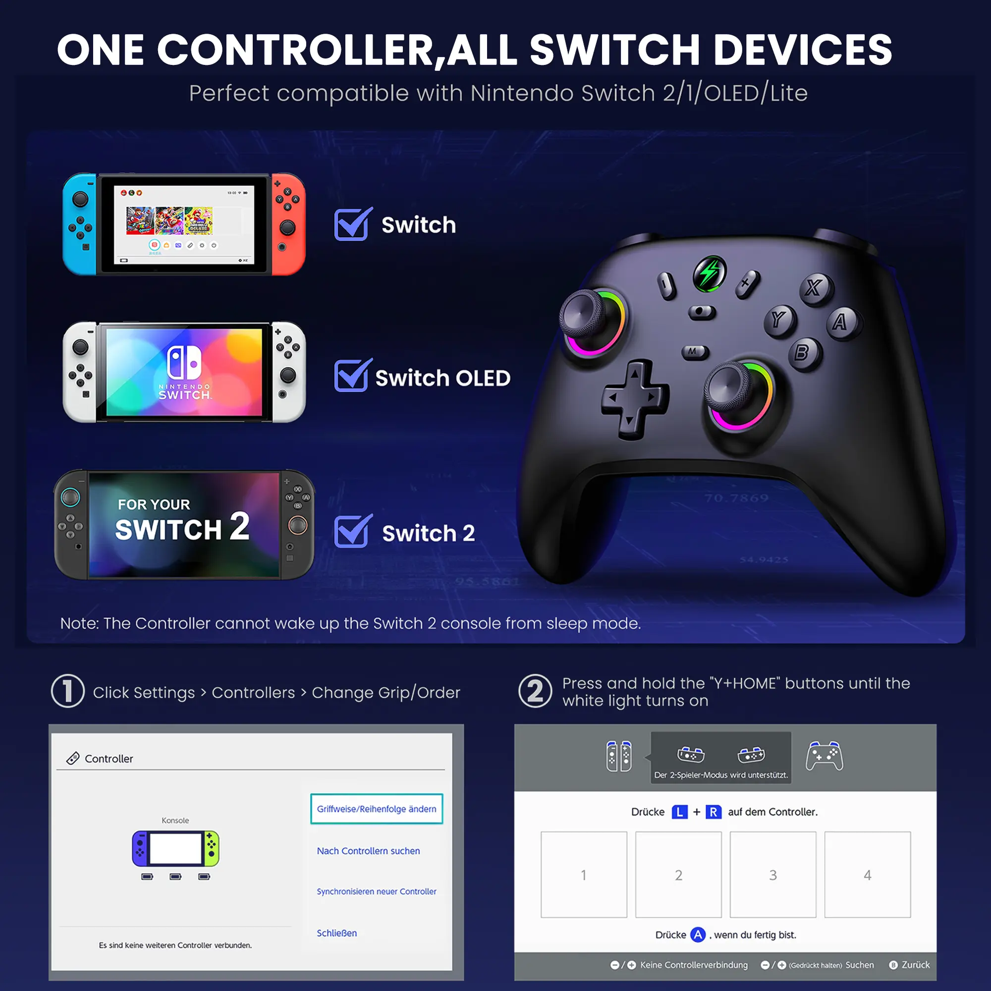 【SUPPORTS SWITCH 2 CONNECTION】This switch controller supports connecting to the Switch2 host. Please refer to the product image (last image) for the upgrade guide. Note: The controller does not have the C key for Switch 2 and does not support the one click wake-up function for Switch2 hosts. The remaining controller functions can be used normally when connected to the switch2 host