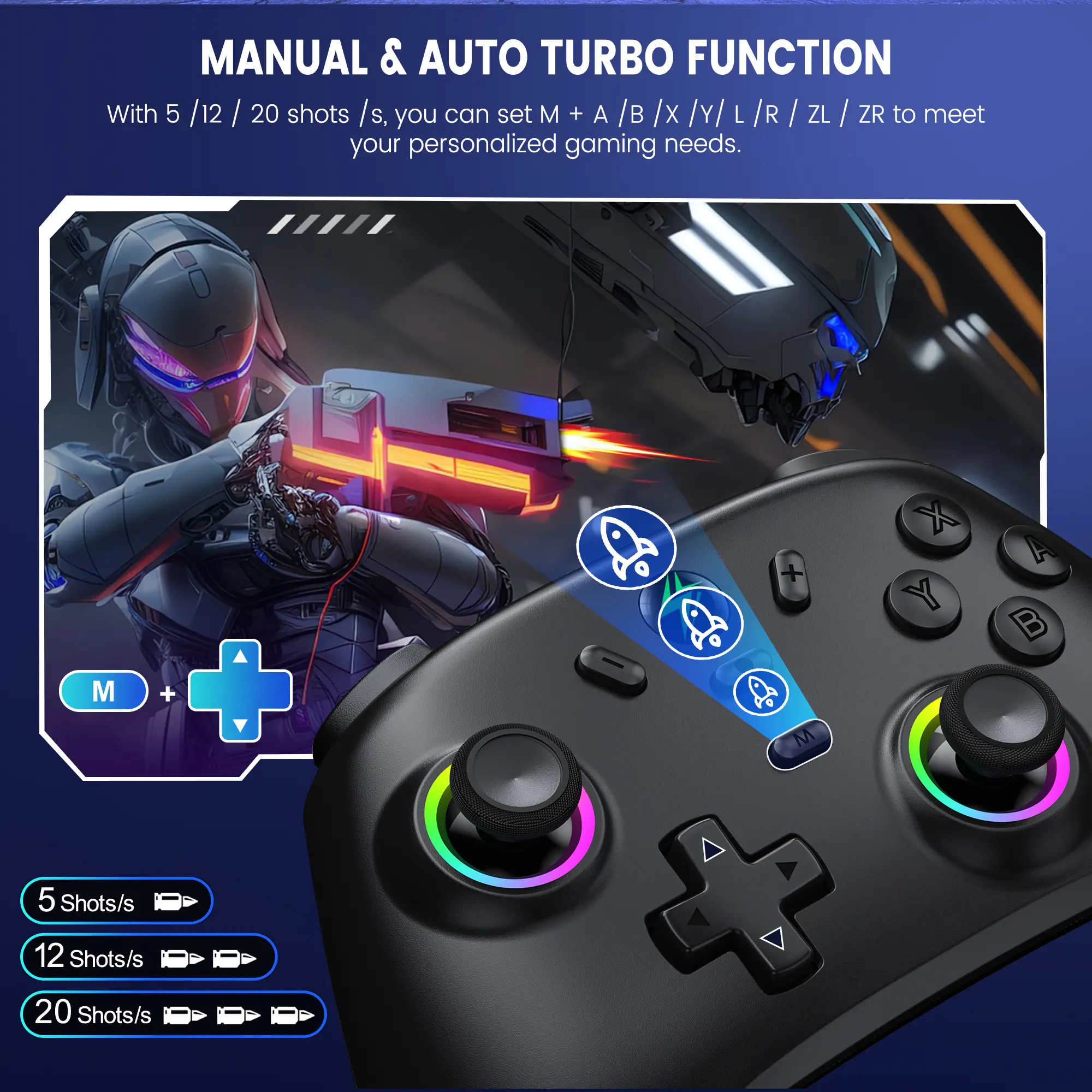 【ADJUSTABLE TURBO & ONE KEY TO WAKE UP】 A/B/X/Y/L/R/ZL/ZR buttons can be set to auto/manual TURBO function, the speed adjustable in three levels, free your fingers and make you easier to win an arcade or action game. The controller support one key to wake up the switch controller, after the first connection, next time just simply press "HOME" key to wake up and re-connect the pro controller