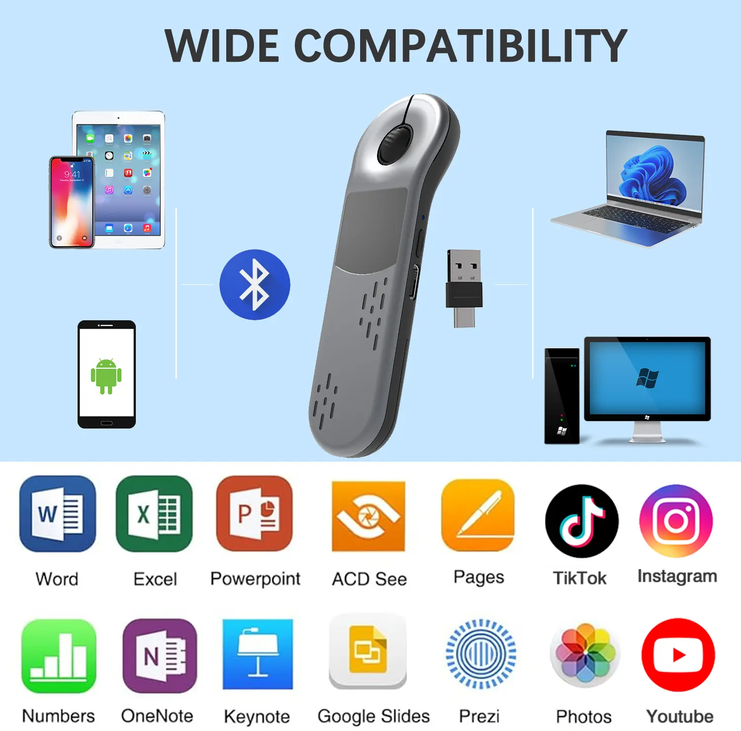 Wide Compatibility – Works flawlessly with PowerPoint, Keynote, Google Slides, and more on both Windows and macOS. Effortlessly navigate slides, control volume, click hyperlinks, and scroll through short videos using intuitive buttons.