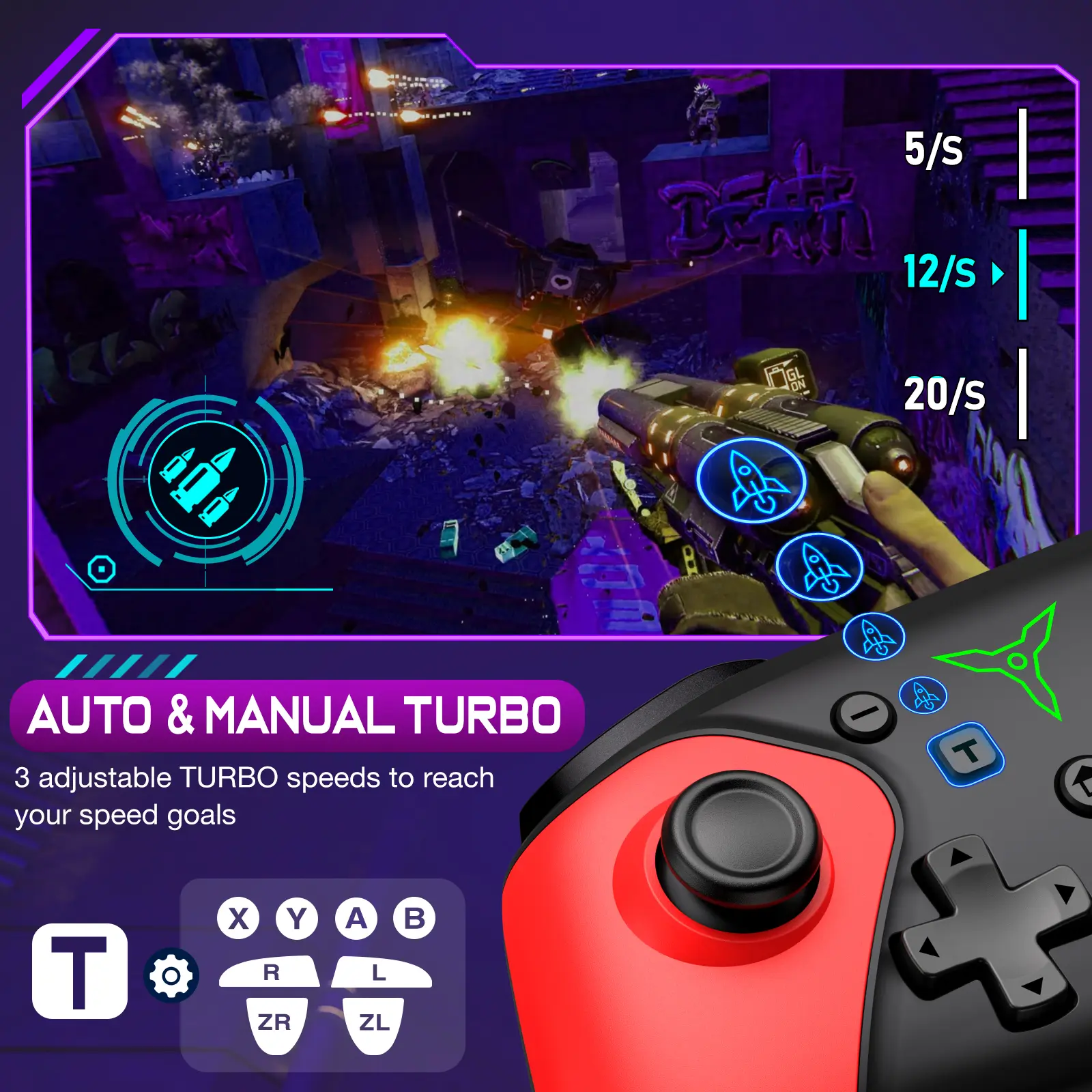 ·🎮 【4-Level Vibration & 3-Speed Turbo Function】 This Switch Pro controller features four vibration modes (Off/Low/Medium/High) for a more immersive gaming experience. You can adjust the vibration intensity to suit different games. Additionally, it comes with a TURBO function offering three speed settings (4 times/sec, 8 times/sec, 16 times/sec). For fighting games, the turbo feature is a great way to gain an edge! It supports both auto and manual turbo modes.