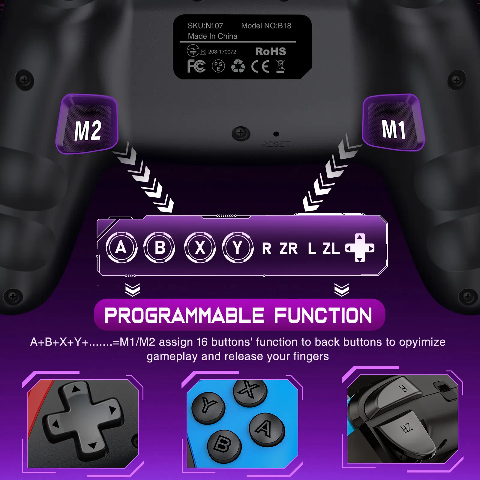 ·🎮 【Custom Macro Function】 Equipped with macro-programming functionality on the back, this Switch controller allows you to pre-set complex command sequences and execute them with a single button press. Easily register frequently used actions and special moves, making it incredibly convenient. This controller lets you effortlessly perform crucial "combos" in various games, from action titles to mini-games. Enhance your gameplay and enjoy yourself!