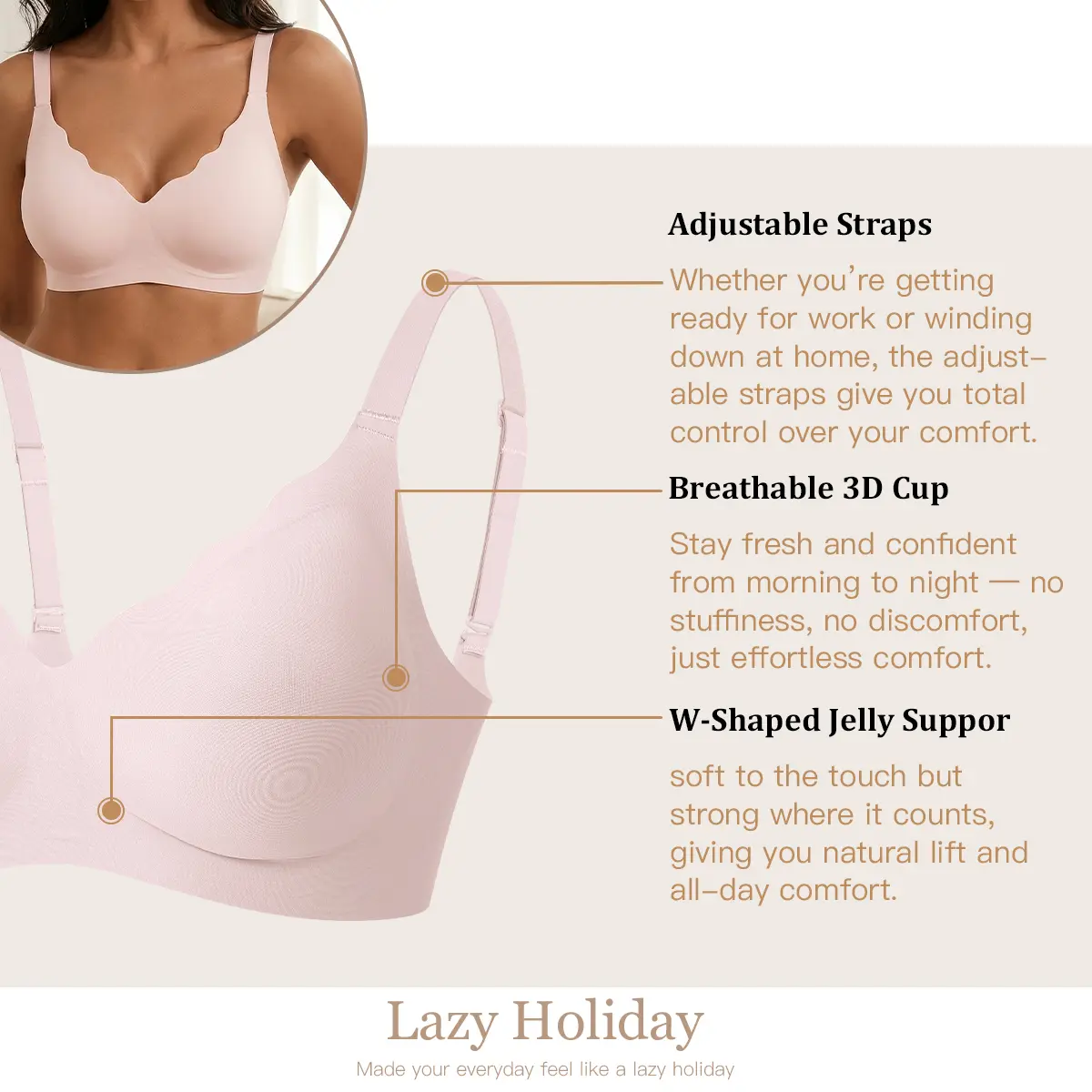 ·slight Push-Up:This bra doesn't offer strong push-up effects; it provides a more natural, subtle lift. However, it won't provide significant shaping or support for smaller breasts. The main purpose of this bra is natural comfort.