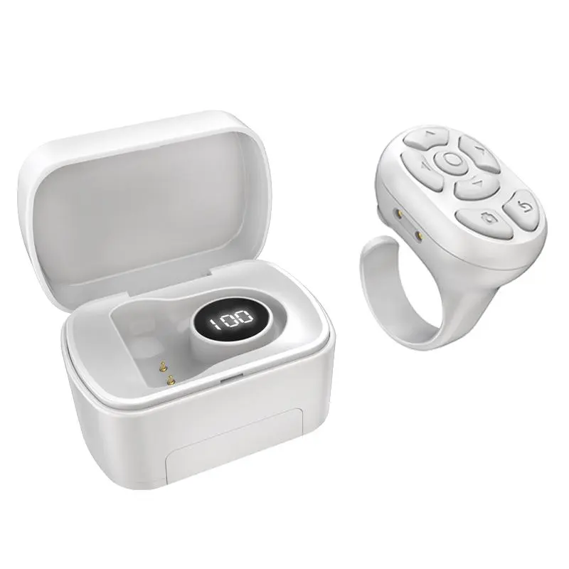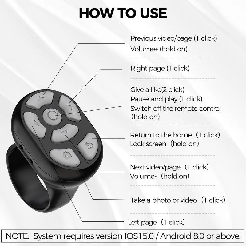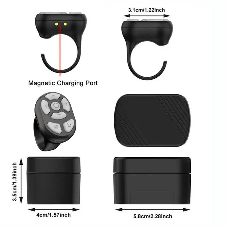 Ever struggled to snap the perfect selfie or control your phone camera from a distance? Meet your new best friend: the wireless remote control ring with a bright digital display! This sleek, USB rechargeable ring features seven easy-to-use keys that let you scroll, click, and snap photos or videos effortlessly. Whether you're capturing memories or turning pages during a presentation, this ring has you covered. Compatible with iOS 15.0+ (just enable AssistiveTouch) and Android 8.0+, it’s designed to keep up with your tech-savvy lifestyle. The magnetic charging port makes powering up a breeze, and the compact ABS design ensures comfort and durability. Inside the box, you’ll find the remote ring, a USB magnetic charger, and a quick start guide to get you going. Ready to upgrade your selfie game and multitasking skills? Grab this wireless finger remote and take control with style and ease!