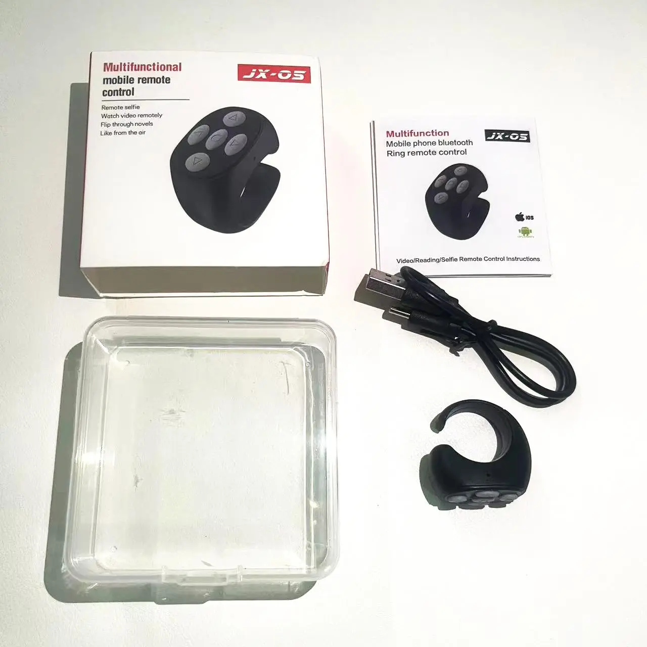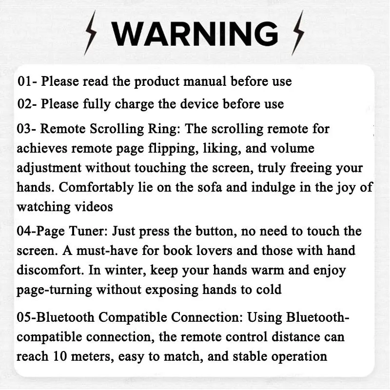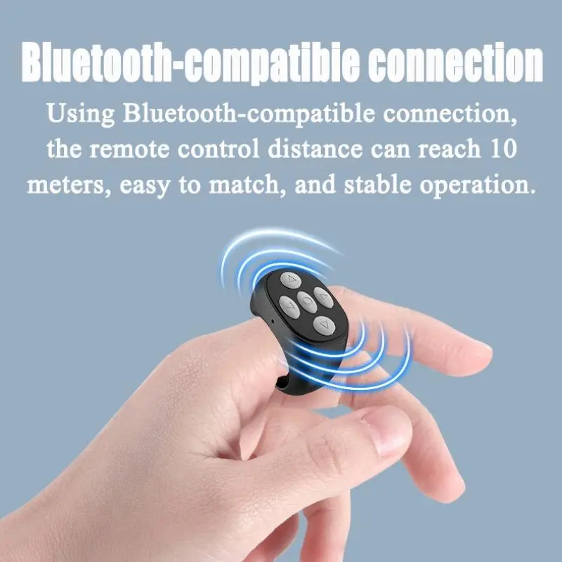 Ever wish you could control your phone or tablet without constantly reaching for it? This multifunctional 5-key wireless remote control ring is your new best buddy. Whether you're binge-watching, reading an e-book, or snapping selfies, this rechargeable ring lets you flip pages, adjust volume, and like posts—all hands-free. No more cold fingers from holding your device; just wear this comfy ring and control everything with a tap. It connects seamlessly via Bluetooth up to 10 meters away, giving you freedom to lounge on the sofa or move around. With a strong 30mAh lithium-ion battery, it lasts about 5 days on standby, so you won’t be charging it constantly. The package includes one remote control ring in sleek graphite black, ready to sync with your phone or tablet. Ready to upgrade your device control? Grab this handy remote ring and enjoy effortless navigation anytime, anywhere!