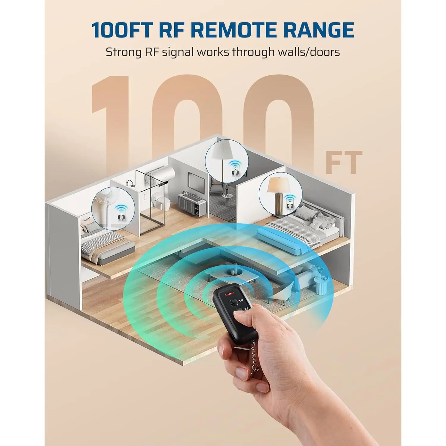 [Key Chain Remote Control &100 FT Control Range] Convenient to store and carry the remote control plug socket with an anti-lost keychain; strong RF signal works through walls and doors up to 100 feet (30m), suitable for open areas such as bedrooms, living rooms, and garages without interfering with other household appliances