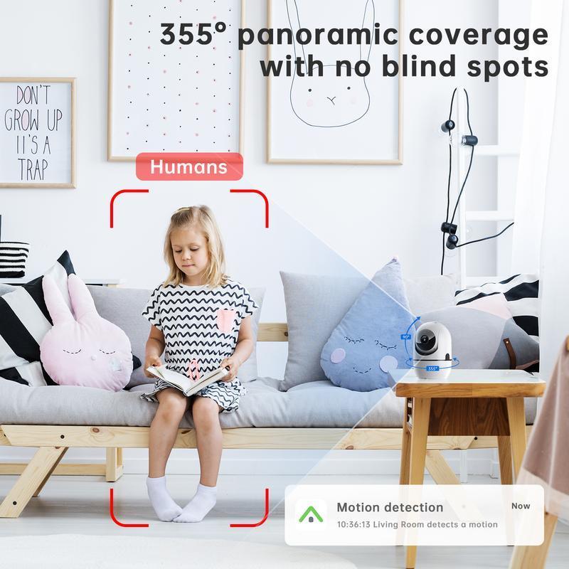 ✅ Two-way voice + PTZ pan/tilt control: remote intercom communication, one-click control of 355° horizontal + 90° vertical rotation on mobile APP, 360° monitoring without blind spots.