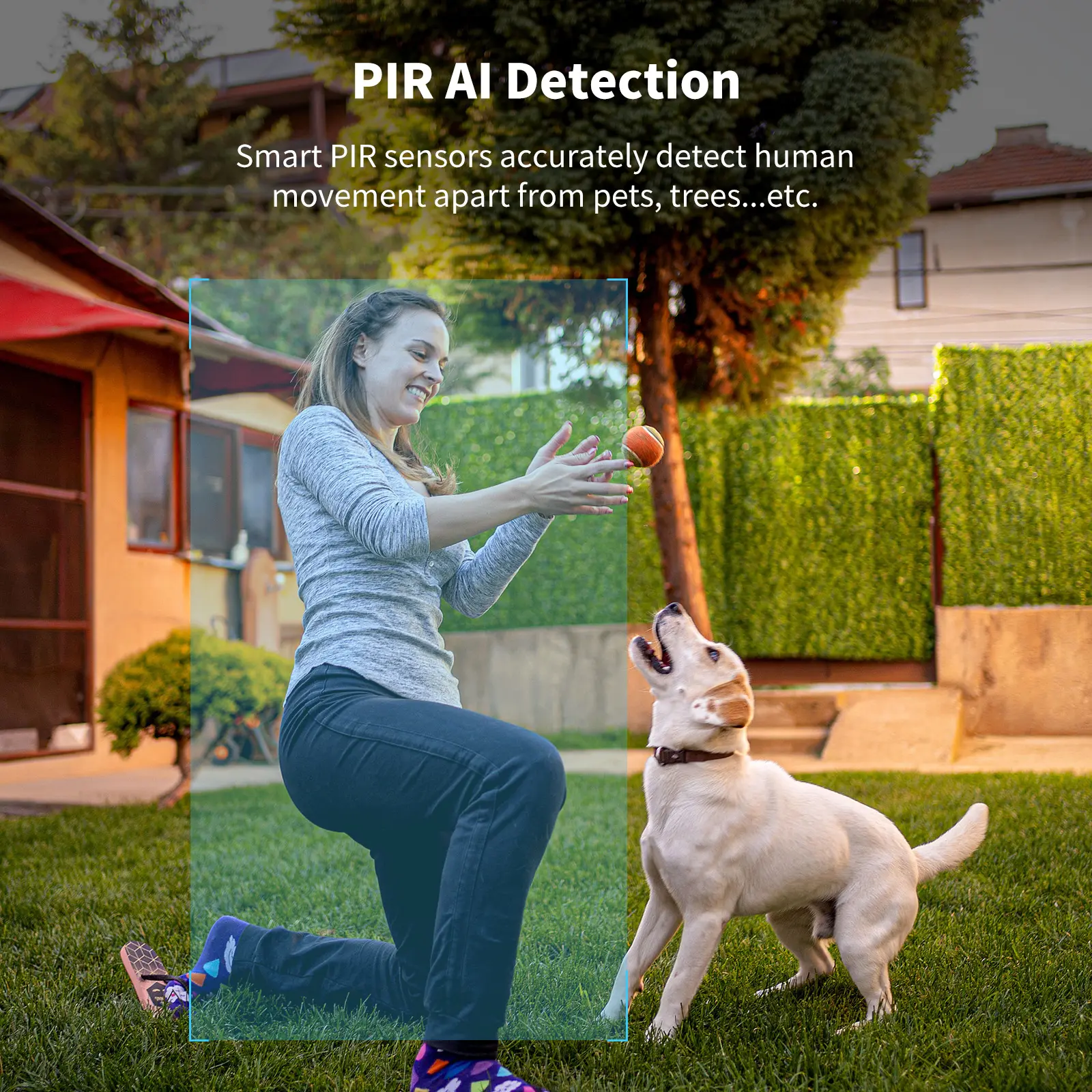 AI + PIR human detection reduces false alerts. Instant app alerts, auto-record. Two-way audio, remote live view, compatible with Alexa.