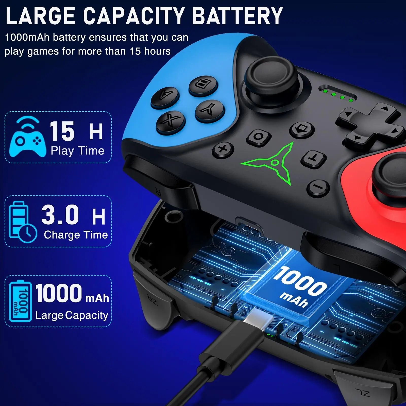 【1000mAh Battery Capacity】Upgraded to a 1000mAh battery, providing extended playtime. The package includes a USB-C charging cable; a full charge takes 3 hours and provides up to 15 hours of gameplay, eliminating battery concerns during gaming.