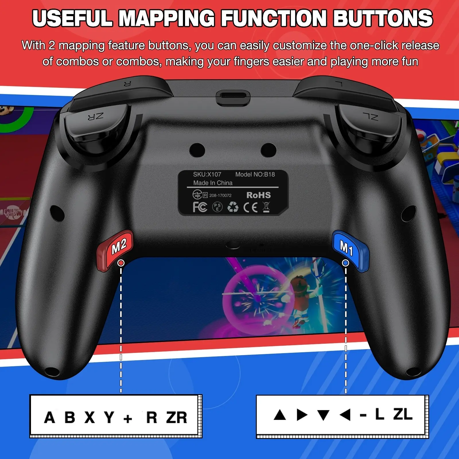 【PROGRAMMABLE FUNCTION for SWITCH DEVICES】 The switch controller with 2 back programming buttons, there are two modes, which are single programming or multi-programming. M1/M2= A+B+Y+L+ZL+R+ZR+D-pad, then you can use other fingers to operate more comfortably and centered. Switch controllers with the programmable buttons helping to minimize button abuse and stick clicking it can last more than several years with heavy use.(No amiibo)