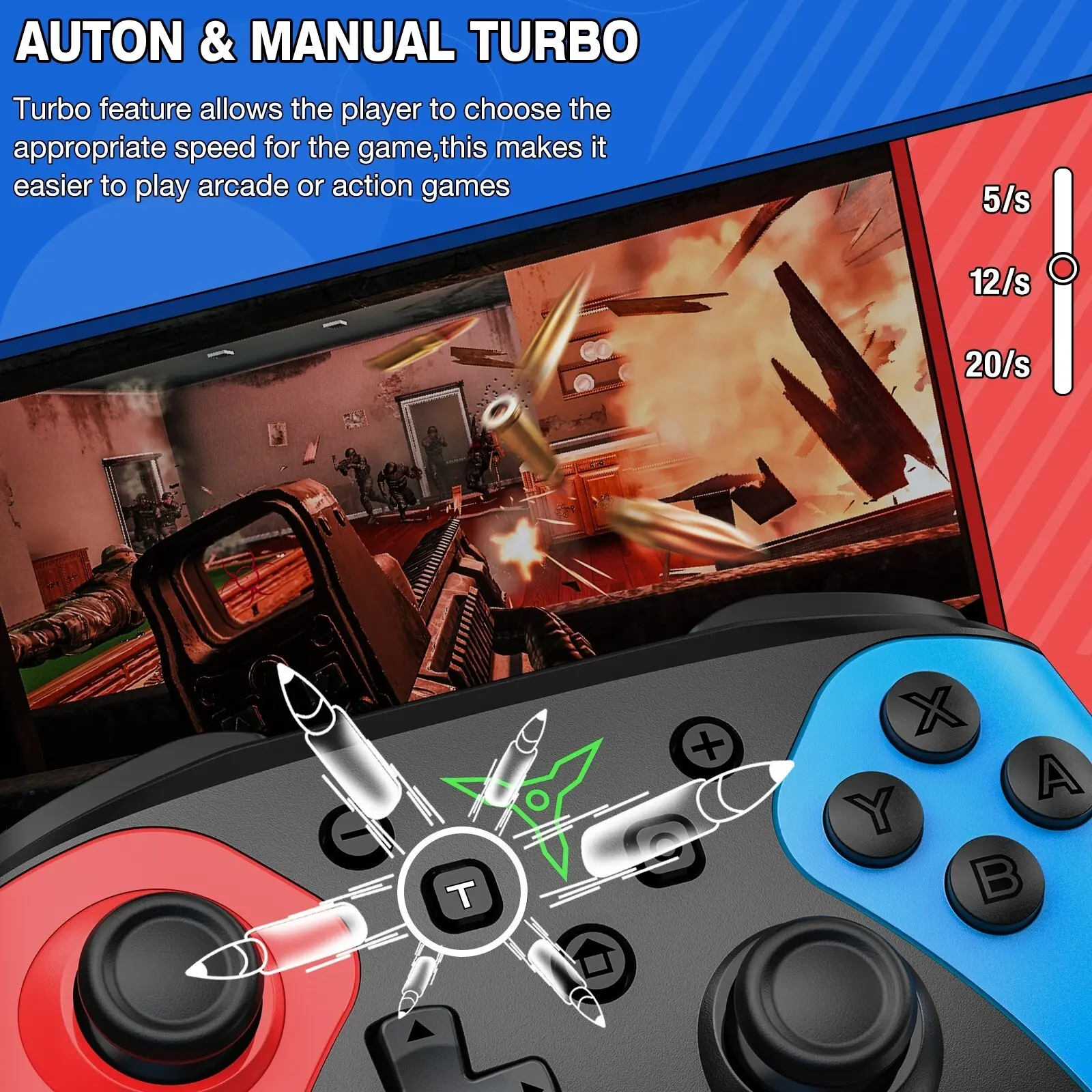 【ERGONOMIC DESIGN & TURBO FUNCTION】 The pro controller switch remote's ergonomic and non-slip design that allows you to control the game stably and don’t have to worry about the sweat in your hands. The wireless switch controller can be set to auto TURBO or manual TURBO mode. There are 3 adjustable speed: 5shots/s, 12 shots/s or 20 shots/s. You also can customize the TURBO button, A/B/X/Y/L/ZL/R/ZR all buttons can be set to TURBO, which make it easier to win an arcade or action game.