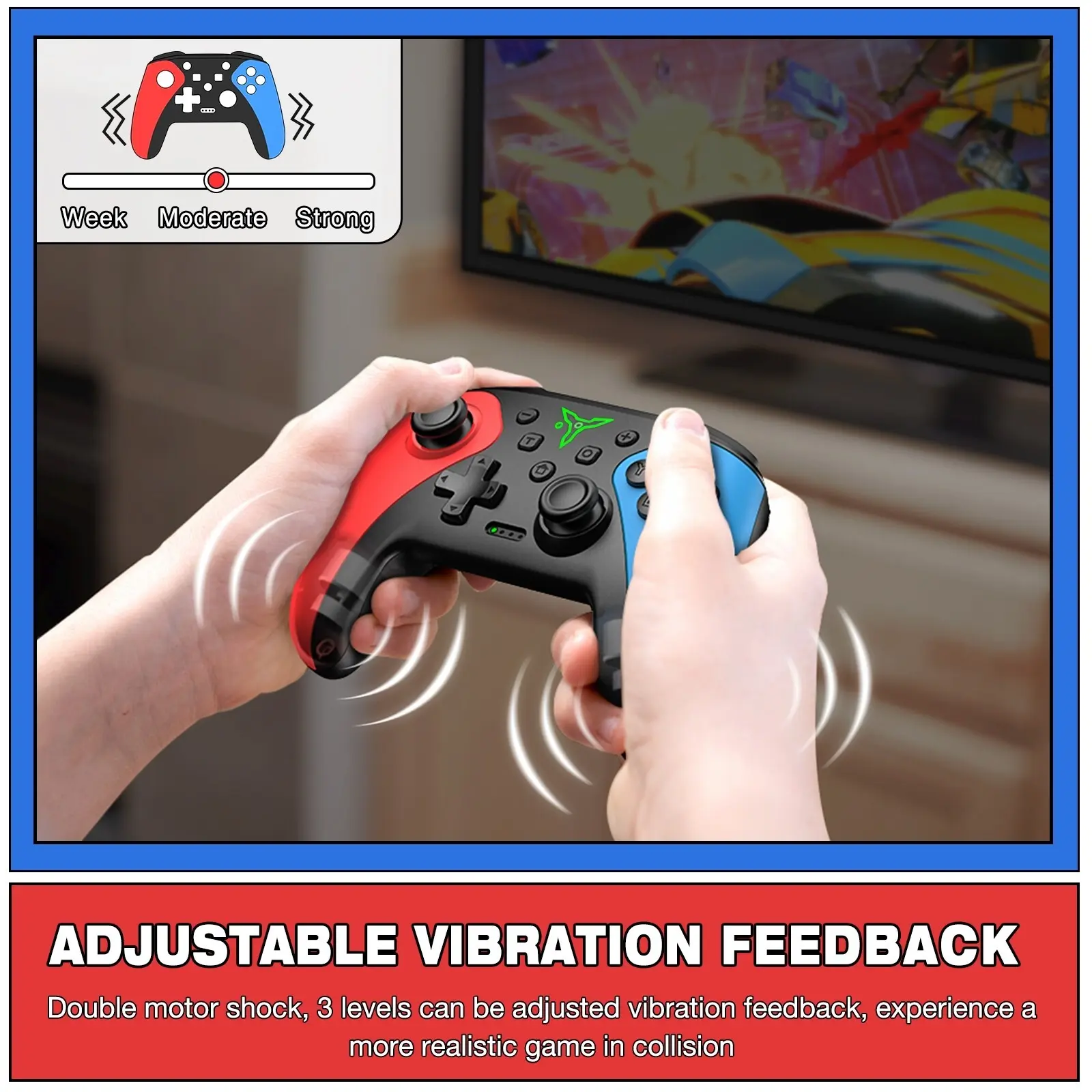 【VIBRATE FUNCTION & GYRO SENSOR】 The controller compatible with switch have dual vibration motors with 3-level precise vibration: weak, medium and strong that provide you excellent vibration feedback to enhance the game immersion. With the 6-axis gyro sensor, this controller can detect the inclination of the controller and make a quick response, give you more fun while playing motion sensing games.