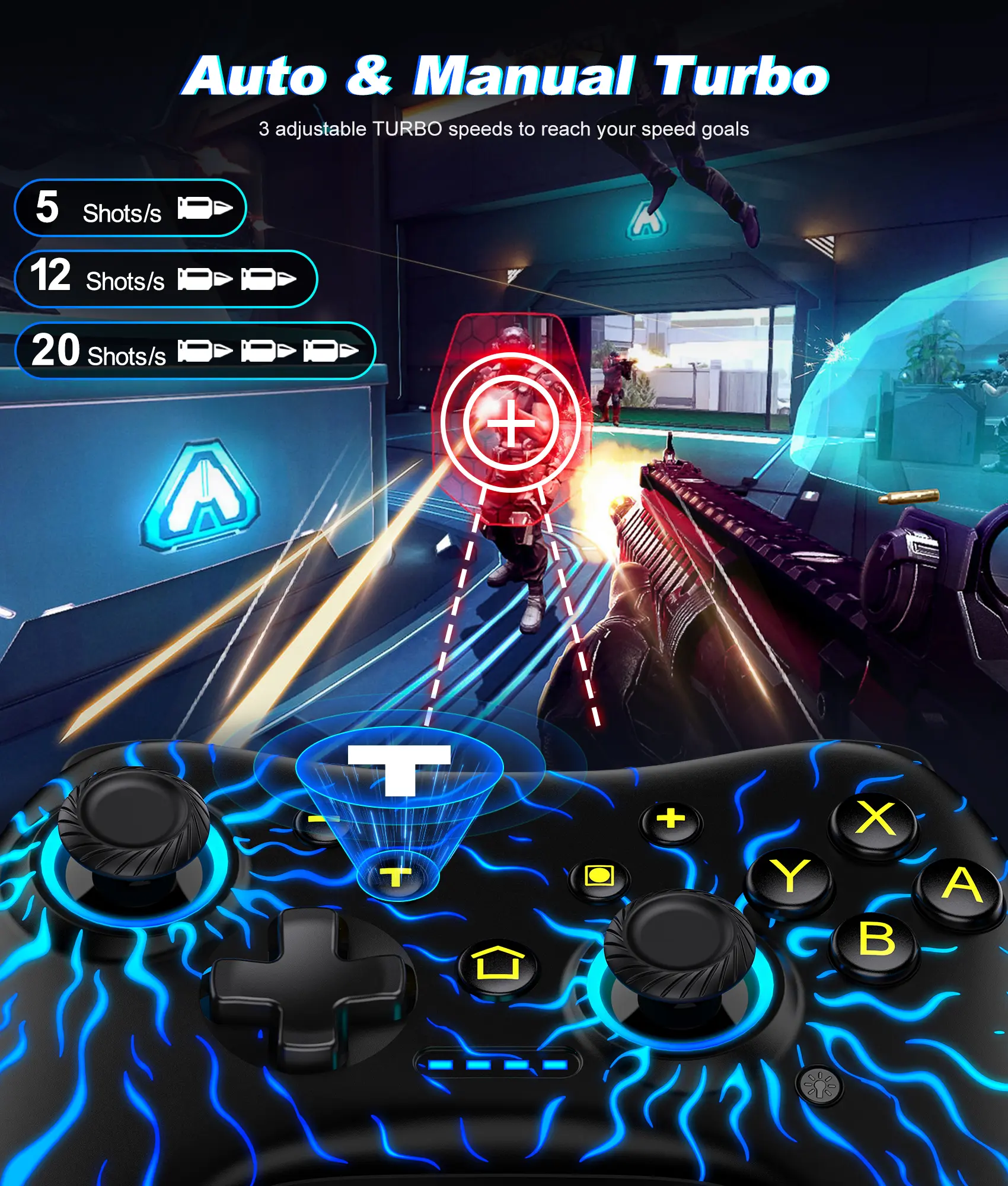 Choose between manual and auto turbo modes and adjust the turbo speed to 5, 12, or 20 times per second. This feature is ideal for intense shooting games, allowing for quick actions and reducing finger fatigue.